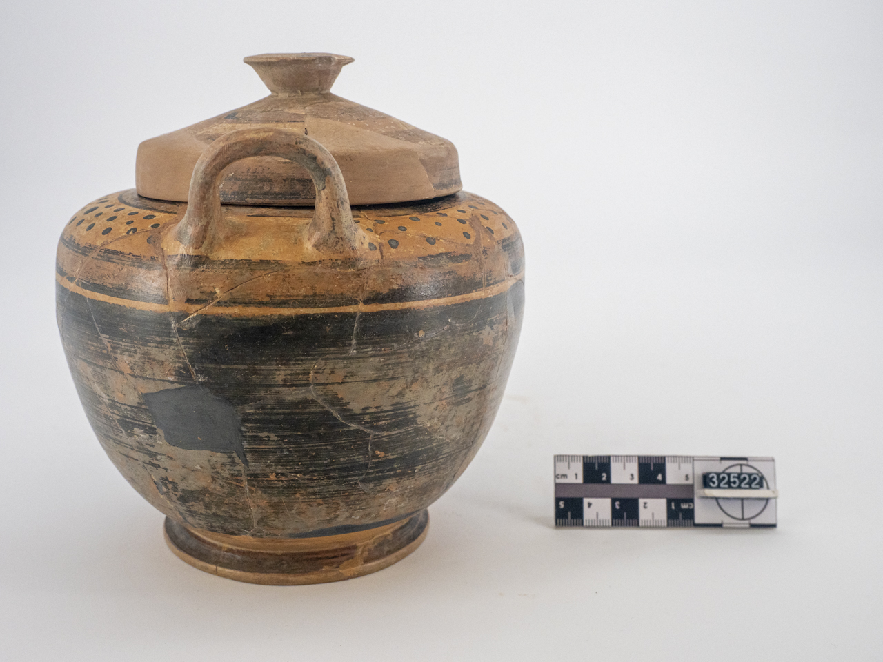 lebes gamikos con piede troncoconico, corpo a profilo convesso, spalla orizzontale, collarino inflesso, anse a bastoncello sormontanti e coperchio con pomello troncoconico; fascia sulla spalla con decorazione a pois