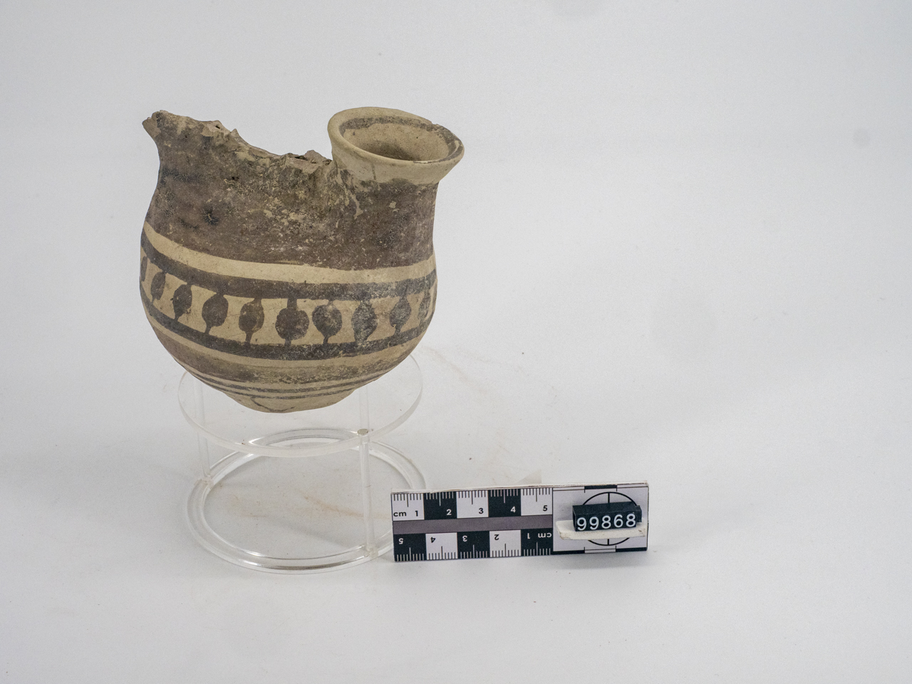 askos miniaturistico con decorazione subgeometrica in bruno e nero su fondo bianco