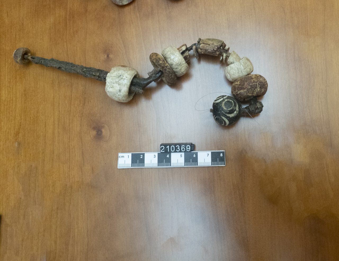 Fibula in ferro con arco rivestito di ambra, avorio, pasta vitrea con pendenti a goccia in ambra (NCTN 1700212418 - INVN 210380)