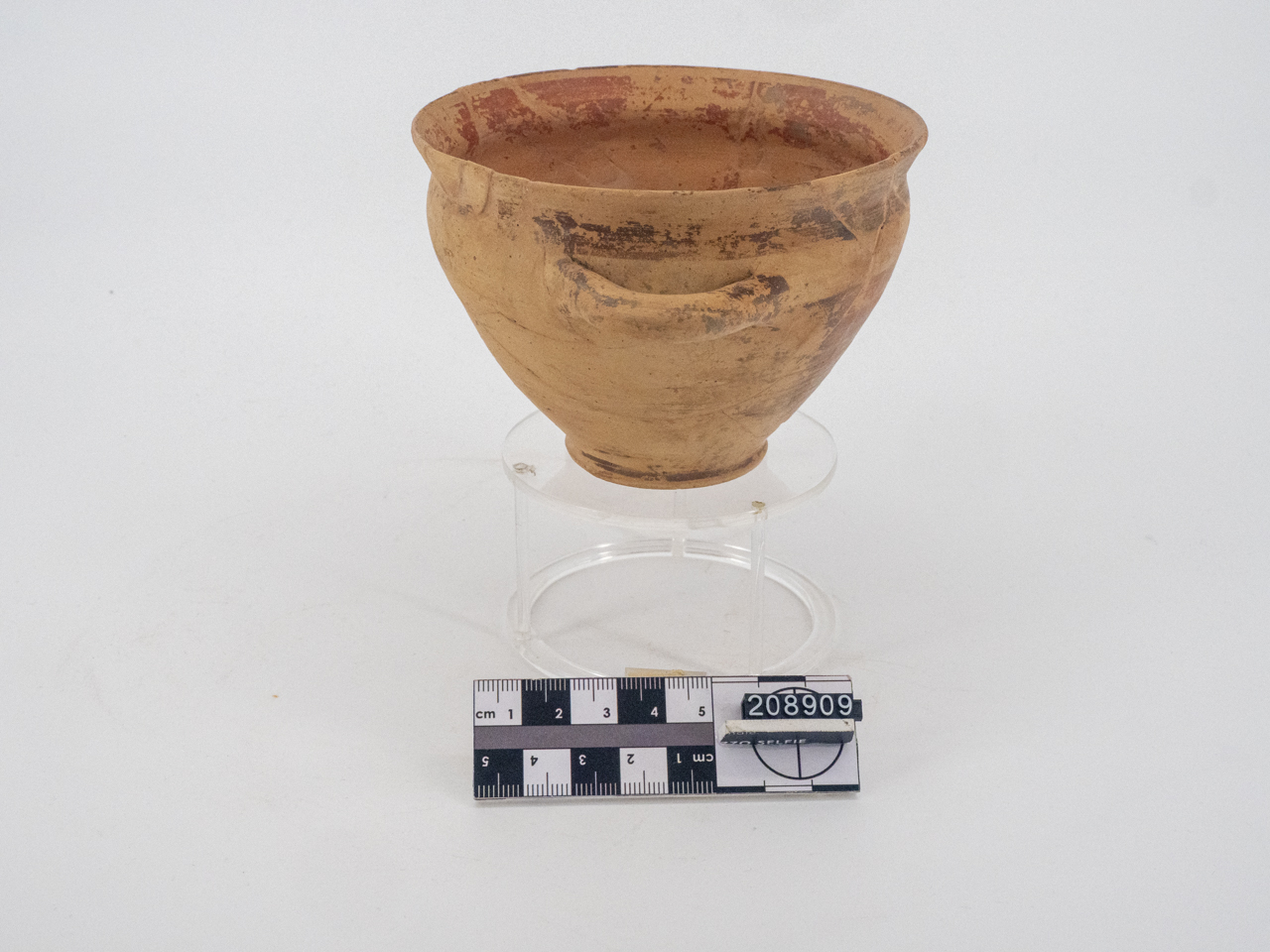Kotyle a bande, orlo assottigliato, vasca ovoide, piede a disco esternamente concavo, anse a bastoncello impostate orizzontalmente sotto l'orlo