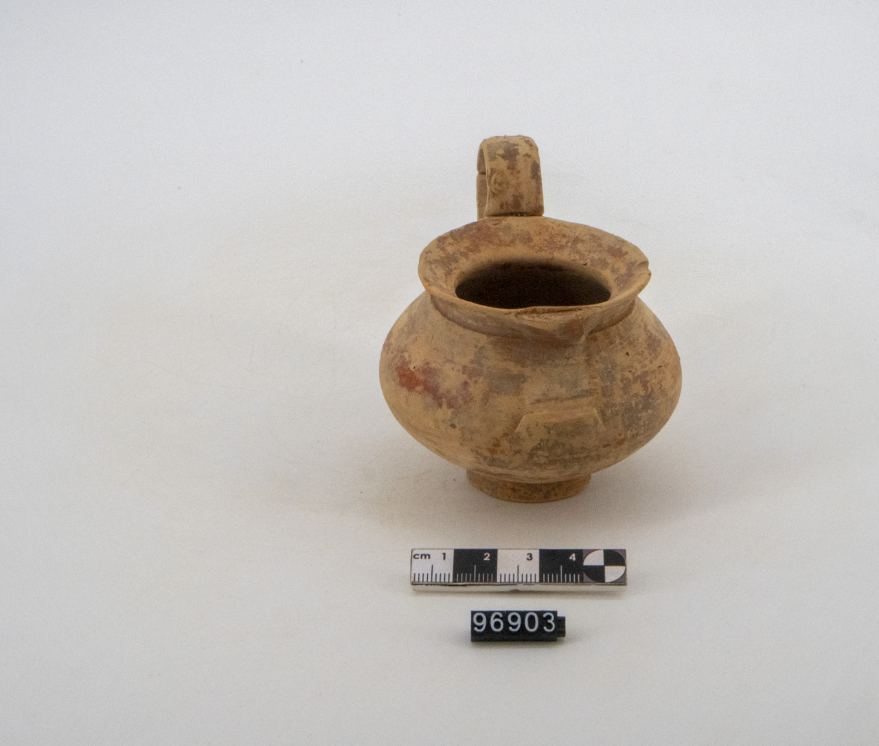 Breve orlo obliquo, corpo globulare compresso, anse a nastro verticale sormontanti, piede a disco distinto