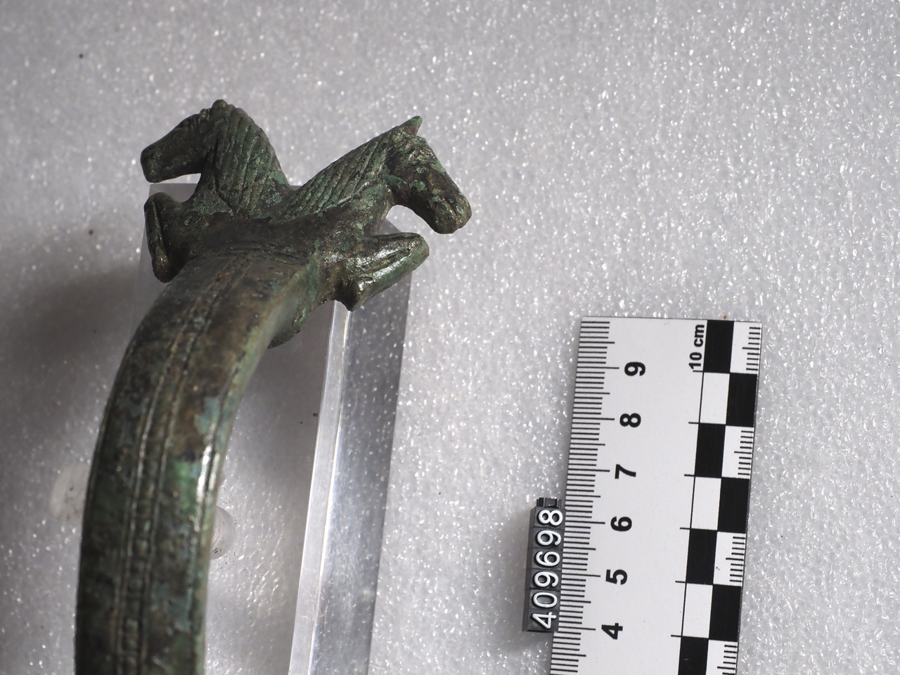 Ansa orizzontale desinente a coppia di protomi equine contrapposte, fila di astragali sul dorso. Il tipo diffuso dal Peloponneso al mondo coloniale magnogreco è attribuito solitamente a fabbrica laconica, anche se non se ne può escludere una produzione tarantina
