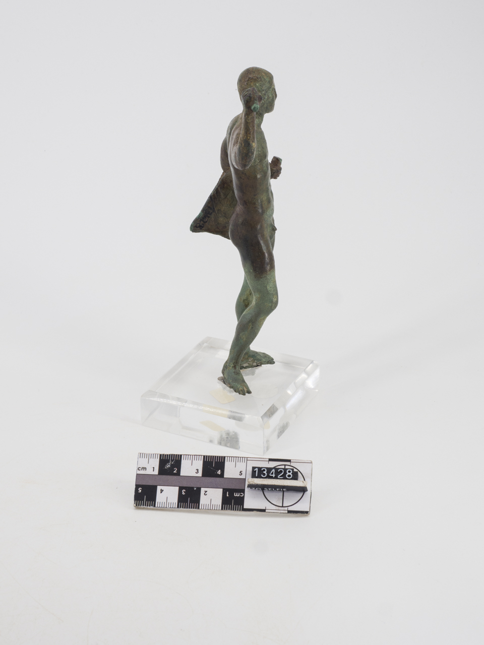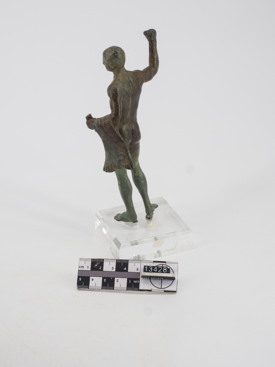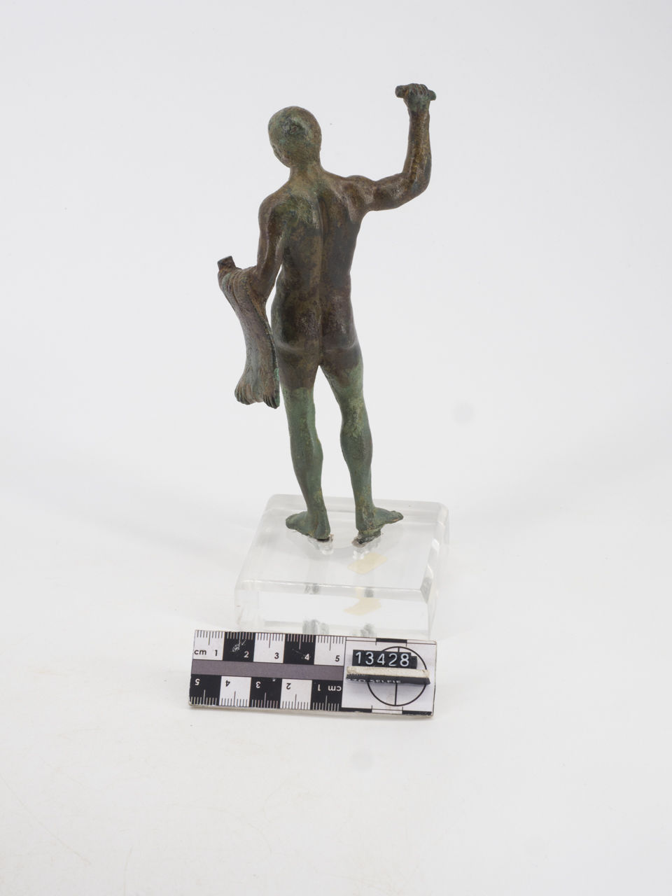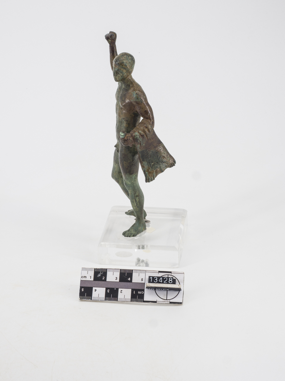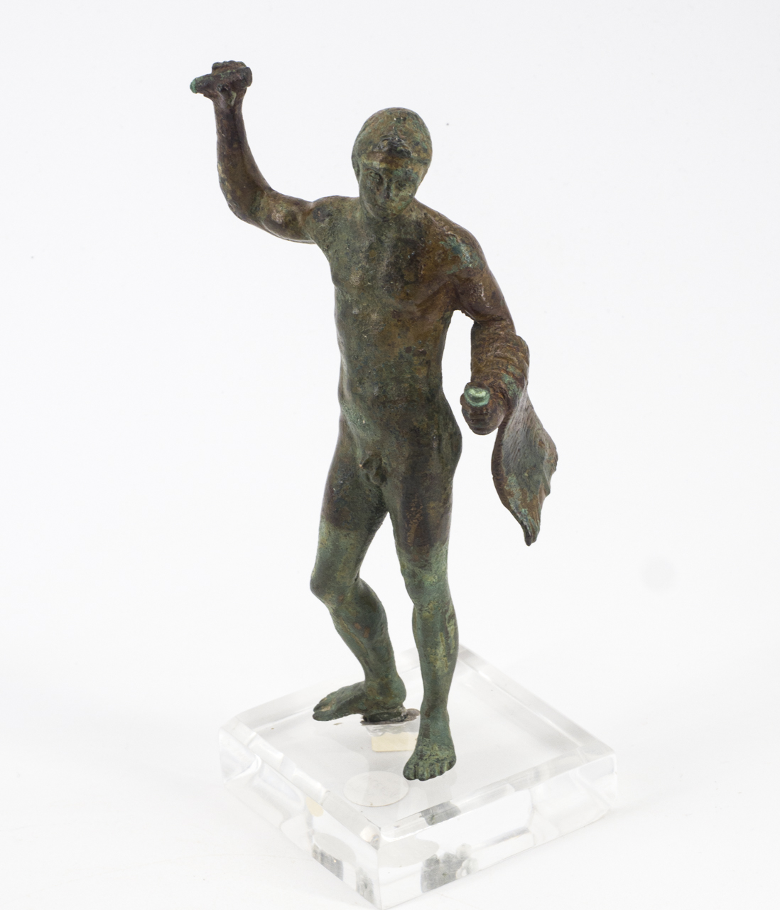 Statuetta raffigurante Eracle. L'eroe, nudo, è raffigurato in atto di avanzare con le gambe ben divaricate: la sinistra poggia saldamente a terra, la destra, arretrata, presenta il tallone appena sollevato. Secondo un comune schema chiastico, la mano destra, portata all'altezza del capo, brandisce un oggetto, forse una clava; la sinistra, protesa in avanti, esibisce un altro attributo, di cui sopravvive solo un pezzo stretto nel pugno; sul medesimo braccio è gettata la grande leontè