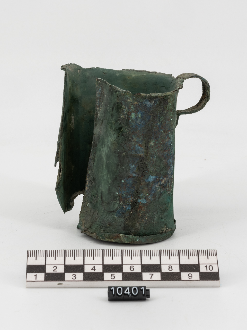 base piana circolare, corpo cilindrico, orlo estroflesso, ansa ad anello, a nastro