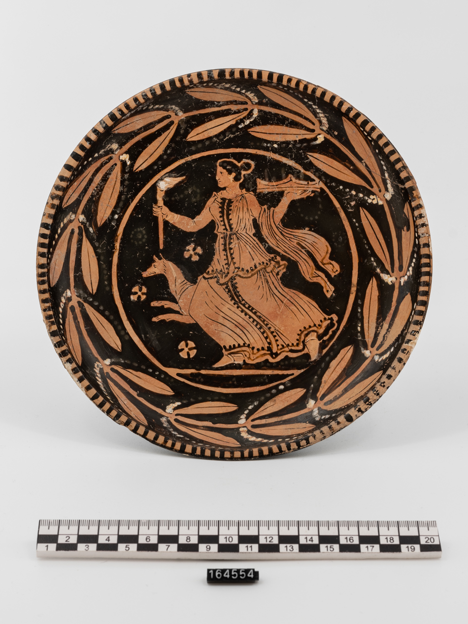 - NOTIZIE STORICO CRITICHE il piatto è attribuito al Pittore di Ascoli Satriano, di cui è stata sottolineata l'affinità stilistica con la pittura a figure rosse di ambito pestano, pur essendo il ceramista associato di solito alla produzione tardo-apula a figure rosse. la collezione archeologica del prof. Paolo Rizzon, conservata a Bari, comprendeva in origine numerosi vasi a figure rosse e reperti appartenenti ad altre tipologie. Nel 1990 lo Stato ha acquistato dal collezionista settantaquattro vasi figurati, destinandoli al Museo Archeologico Nazionale “Domenico Ridola”, ora Museo Nazionale di Matera, dove sono custoditi e in buona parte esposti al pubblico. La maggior parte dei vasi figurati è di produzione apula a figure rosse, alcuni sono di ambito lucano: La collezione, già nota a importanti studiosi come Arthur Dale Trendall e Alexander Cambitoglou, è stata interamente pubblicata nel fascicolo LXIII del Corpus Vasorum Antiquorum, ma restano ancora da identificare i ceramografi che hanno realizzato ventitré vasi