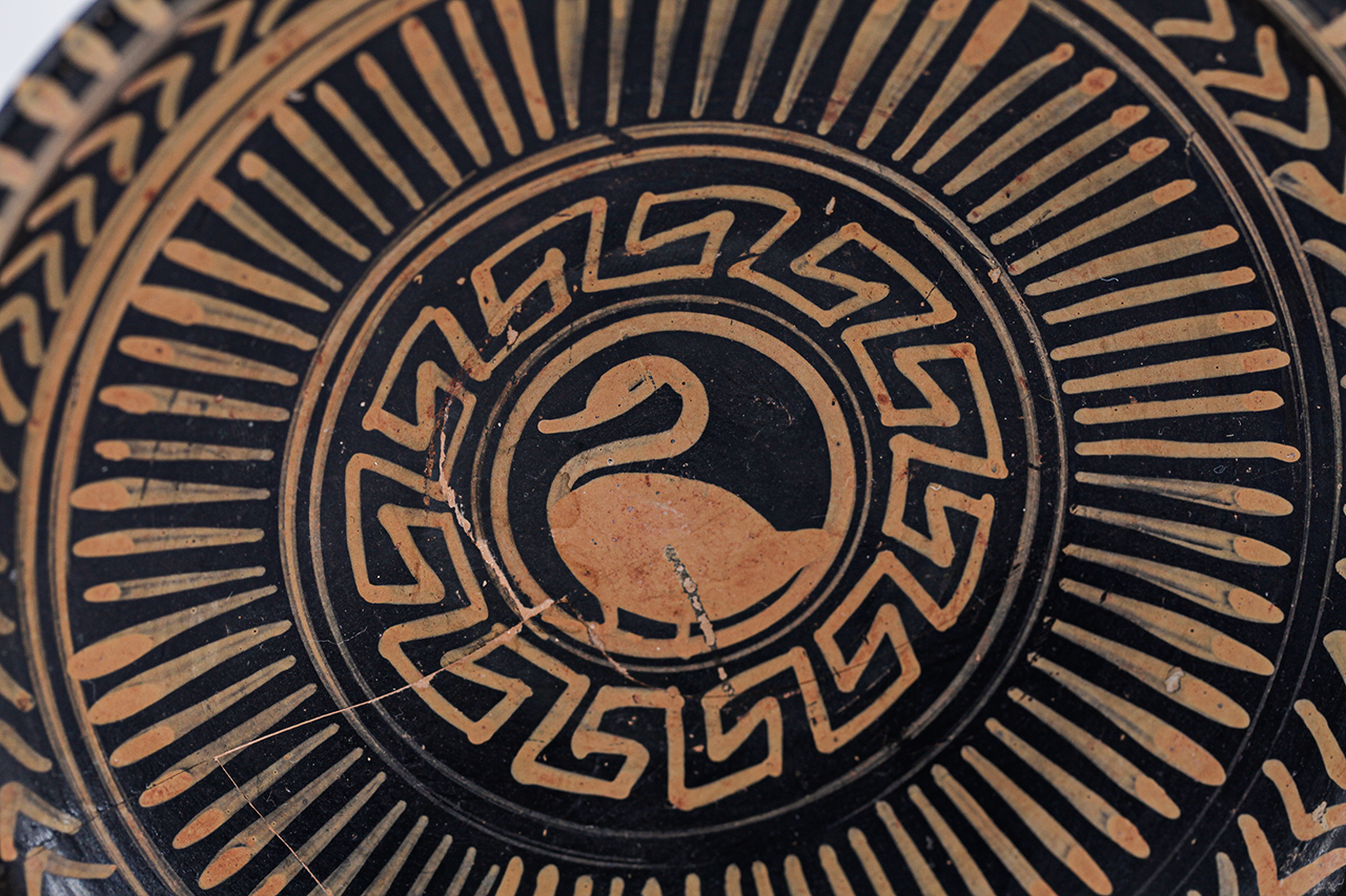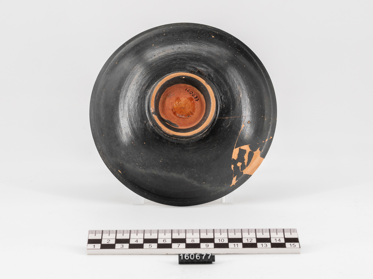 Piede cilindrico con bordo ingrossato ad anello cavo; vasca a profilo teso; orlo arrotondato lievemente espanso. Argilla nocciola; vernice nera lucente;miltos nella zona cava del piede