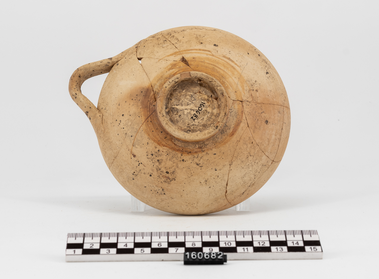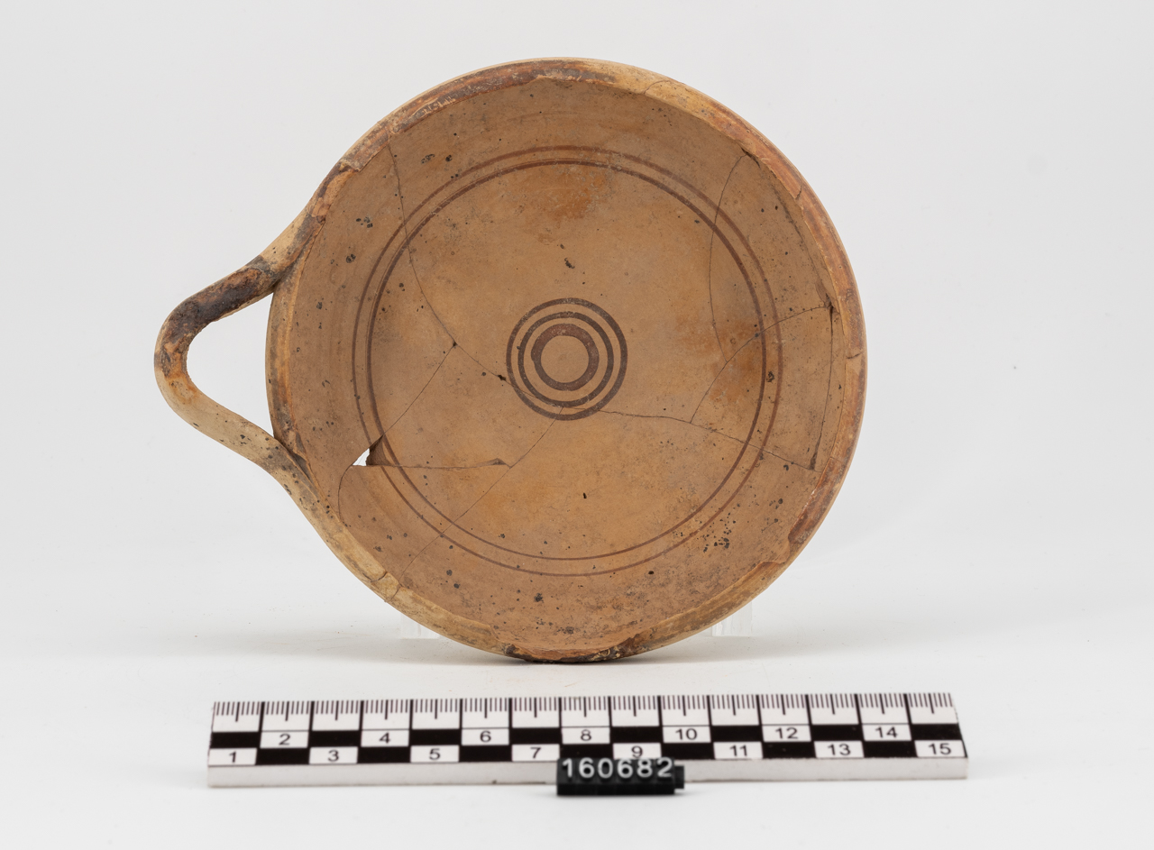 Basso piede ad anello; vasca poco profonda con orlo rientrante; ansa obliqua a bastoncello. Argilla rosata; vernice bruna diluita