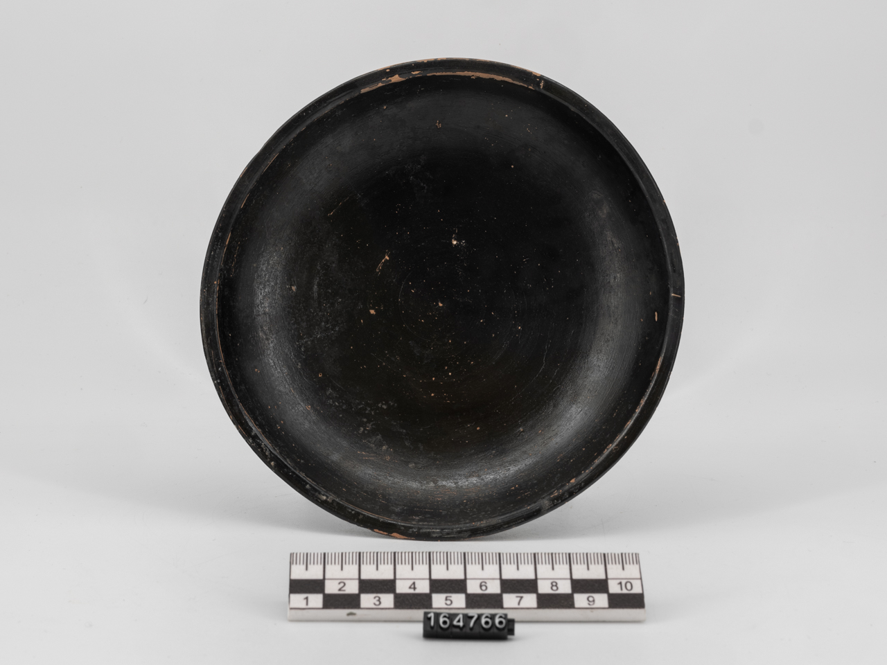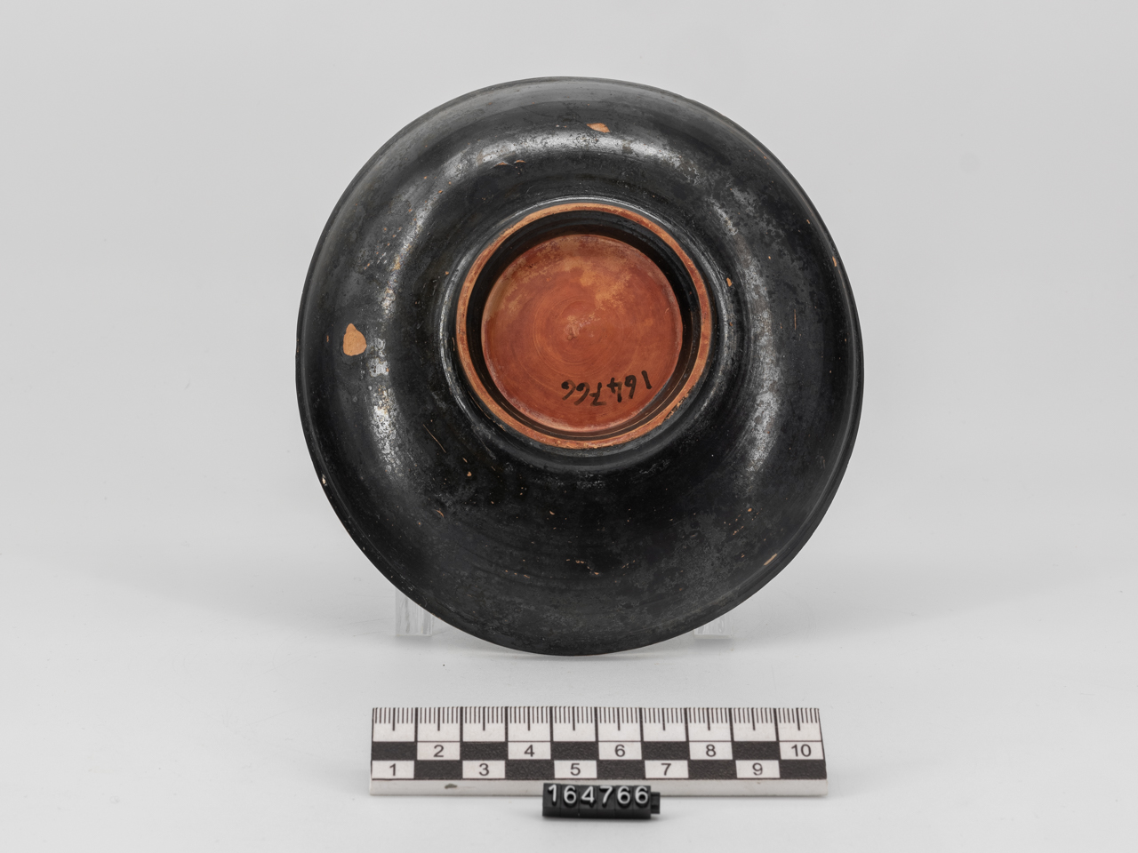 Piede ad anello con profonda risega; vasca a profilo convesso; orlo piatto, obliquo verso l'esterno. Argilla di colore arancio chiaro; vernice nera semilucente, parte interna del piede a risparmio