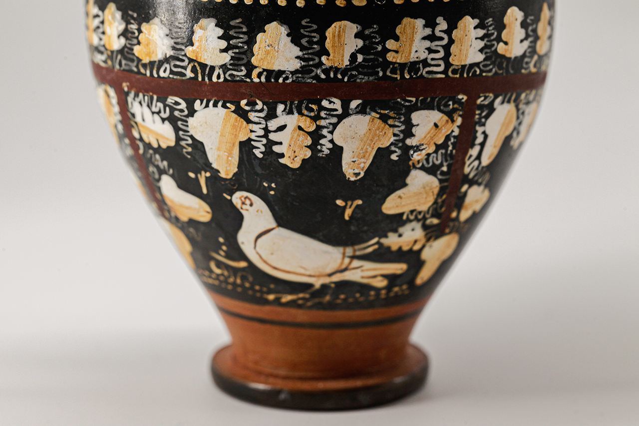 Piede a disco; corpo ovoide, fortemente rastremato verso il basso; labbro lievemente estroflesso con orlo leggermente arrotondato. Anse orizzontali a bastoncello lievemente schiacciato, impostate al di sotto dell'orlo. Argilla di colore nocciola pallido; vernice nera lucente; decorazione graffita e sovraddipinta in bianco, giallo e amaranto. Risparmiati l'anello di appoggio, il fondo all'interno del piede, la parte superiore esterna del piede e due fasce sulla parte inferiore del corpo