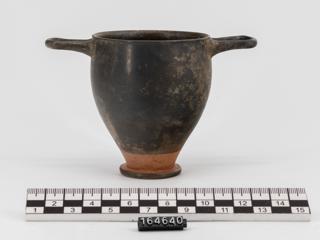 Piede ad anello; vasca ovoidale molto rastremata nella parte inferiore; labbro assottigliato con orlo arrotondato e leggermente estroflesso; anse orizzontali a nastro impostate al di sotto del labbro. Argilla rosata. Venice nera semilucente con riflessi metalli dovuti a difetto di cottura
