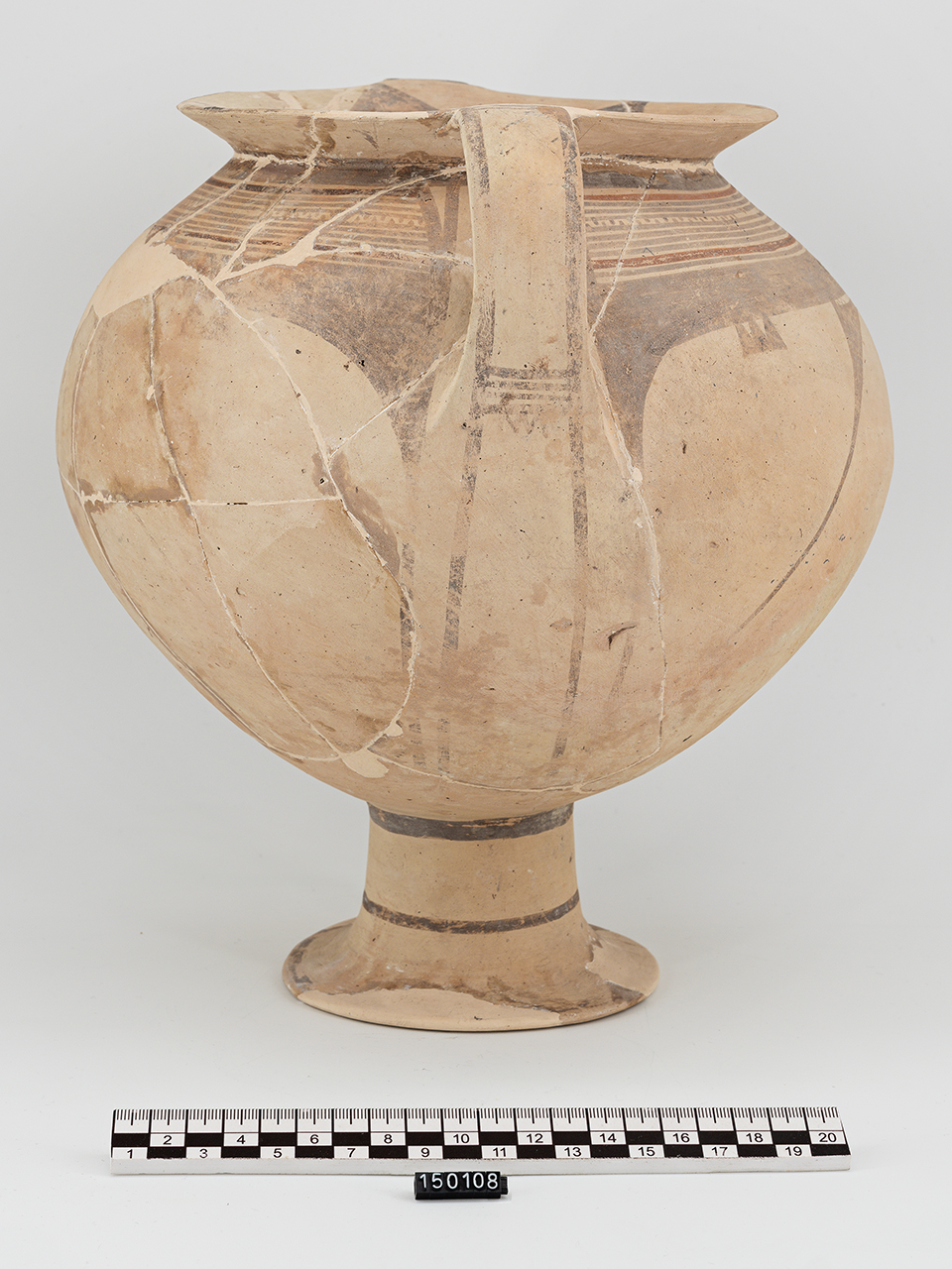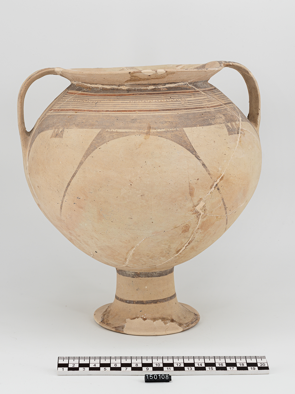 Olla con piede a disco su alto fusto troncoconico; corpo globulare leggermente rastremato verso il basso, orlo distinto, svasato, inclinato verso l'interno; anse a nastro leggermente sormontanti, impostate superiormente sull'orlo ed inferiormente sul punto di massima espansione del corpo