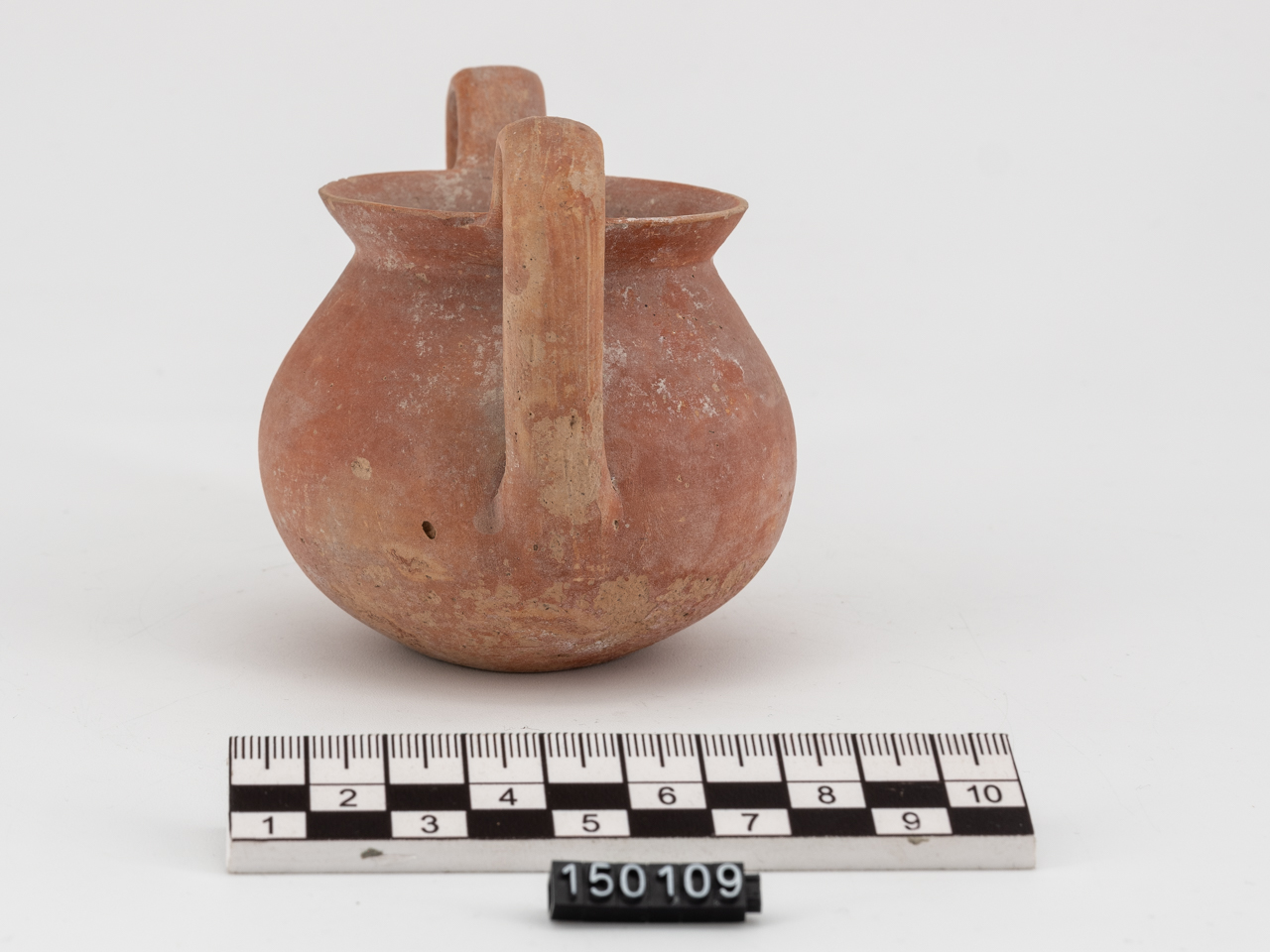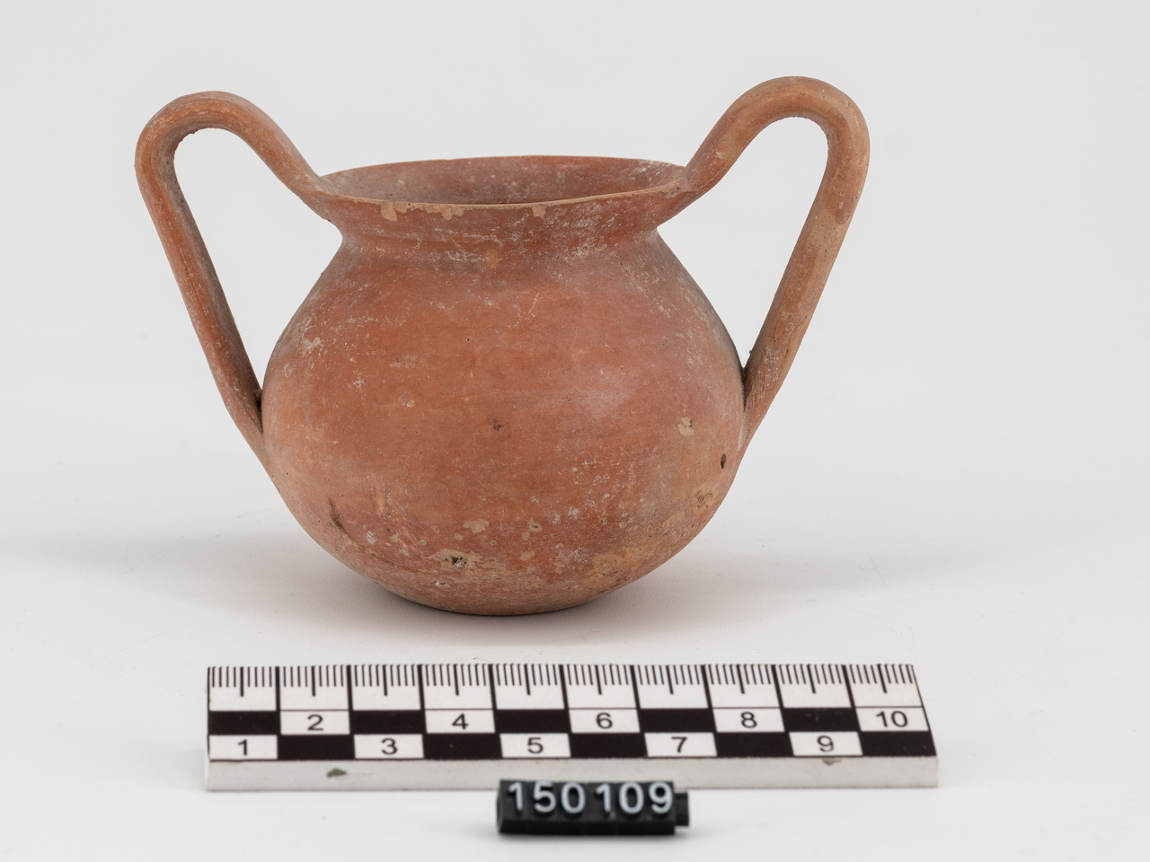 Fondo apodo; corpo globulare ribassato; labbro distinto espanso e inclinato verso l'interno con orlo arrotondato; anse, sormontanti, a nastro ingrossato, impostate sull'orlo e sul punto di massima espansione del corpo