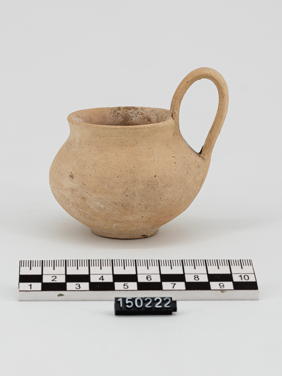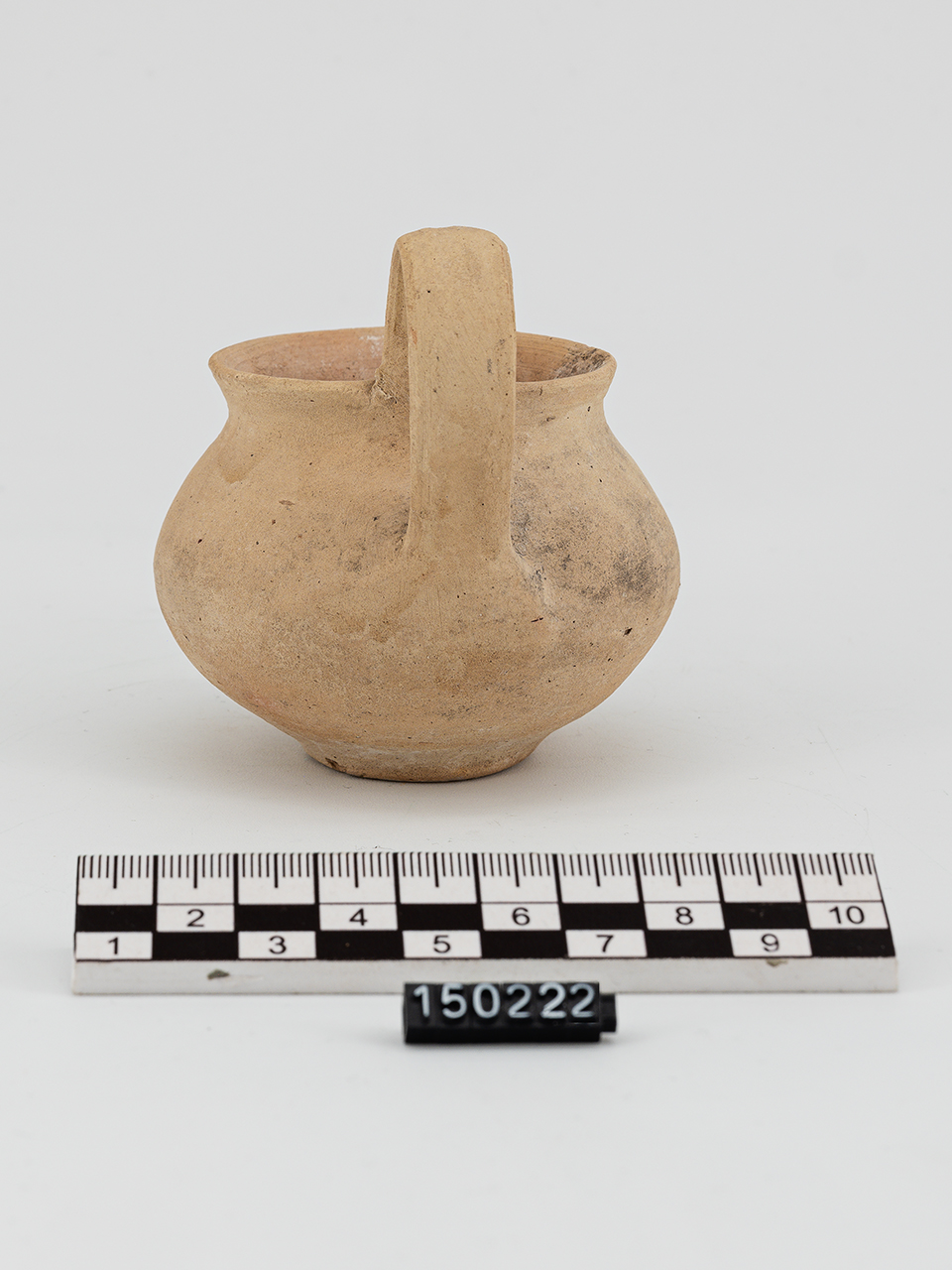 Piede a disco, corpo globulare schiacciato; labbro leggermente estroflesso con orlo arrotondato; ansa a nastro sormontante impostata sull'orlo e sul punto di massima espansione del corpo