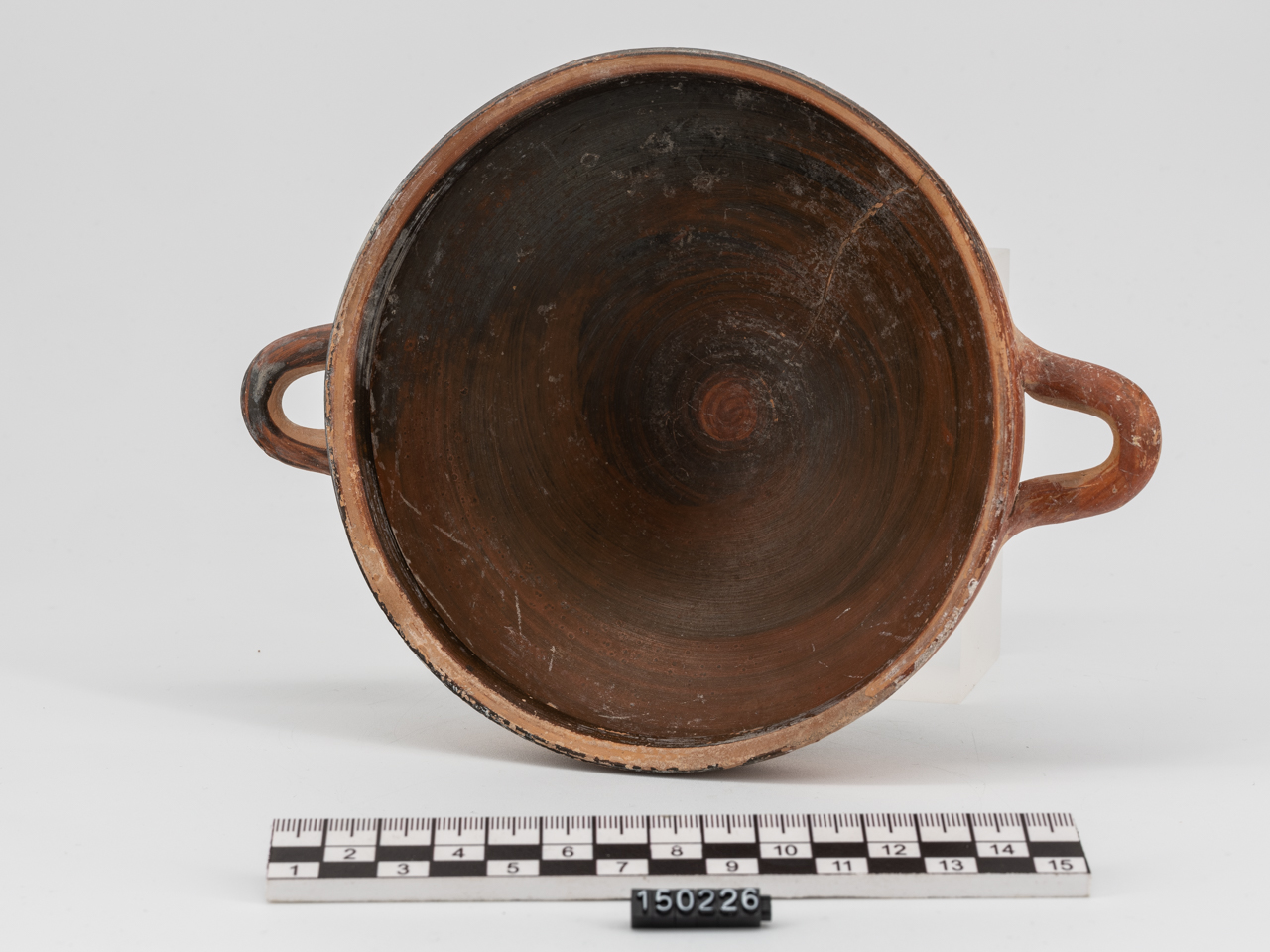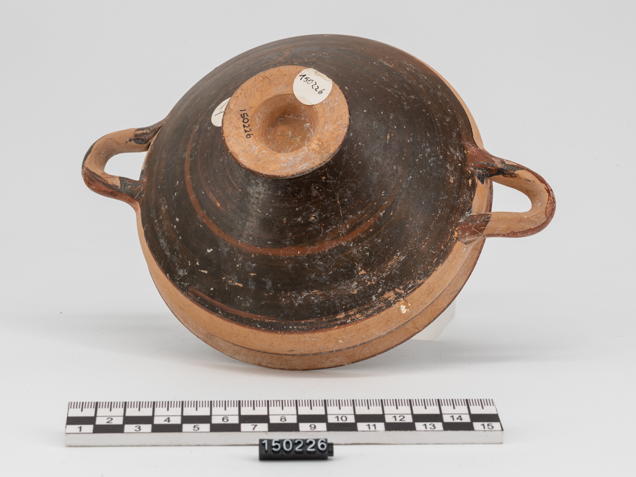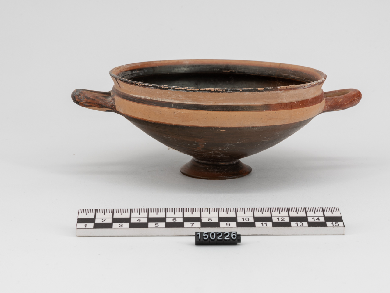Alto piede a disco a profilo svasato; profonda vasca a profilo troncoconico con spalla arrotondata; labbro distinto con orlo arrotondato. Anse a bastoncello orizzontali, impostate sulla spalla