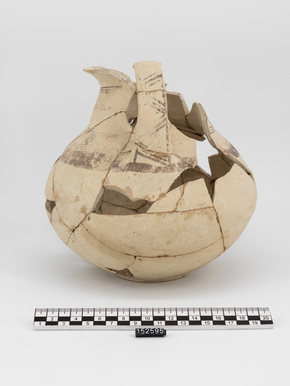Piede a disco; corpo globulare leggermente schiacciato; collo troncoconico; labbro estroflesso con orlo arrotondato; ansa a nastro leggermente sormontante, impostata inferiormente alla base del collo