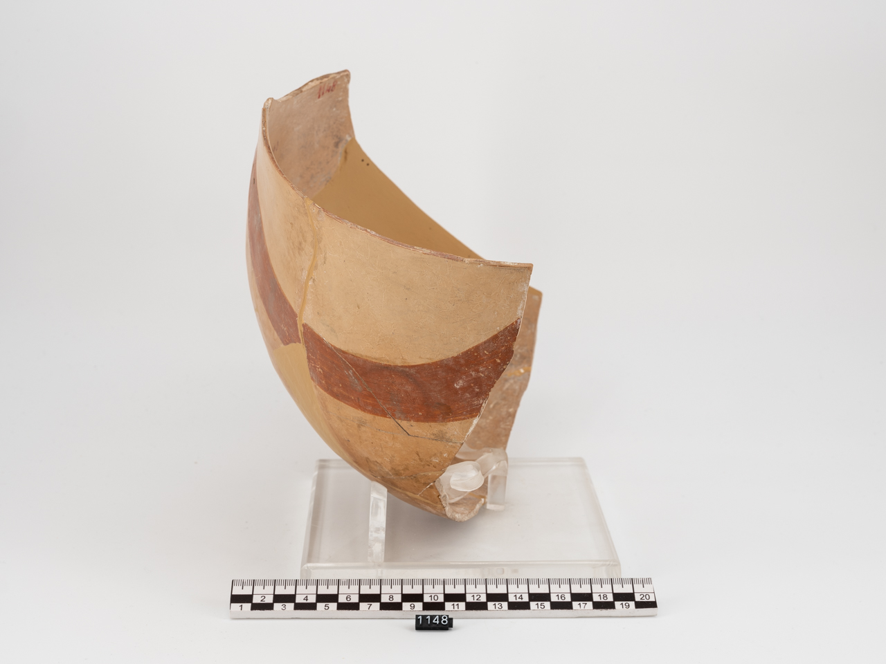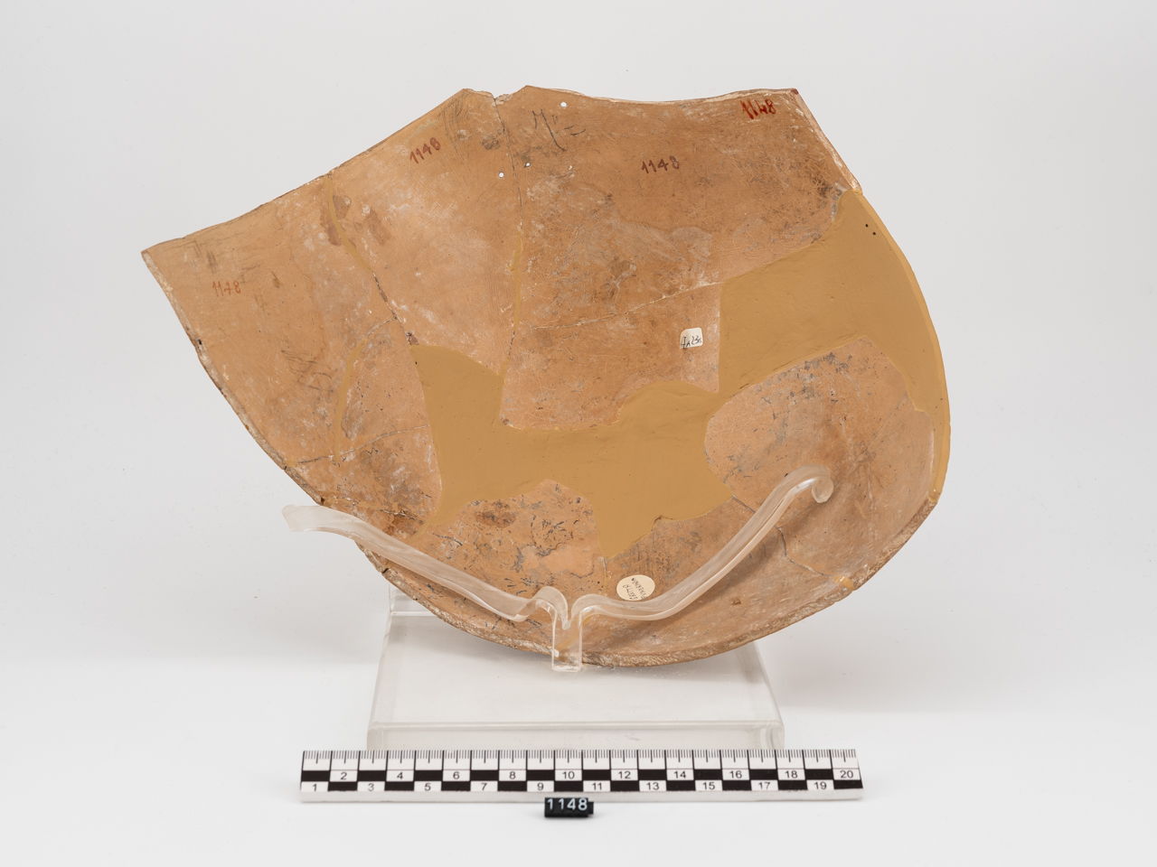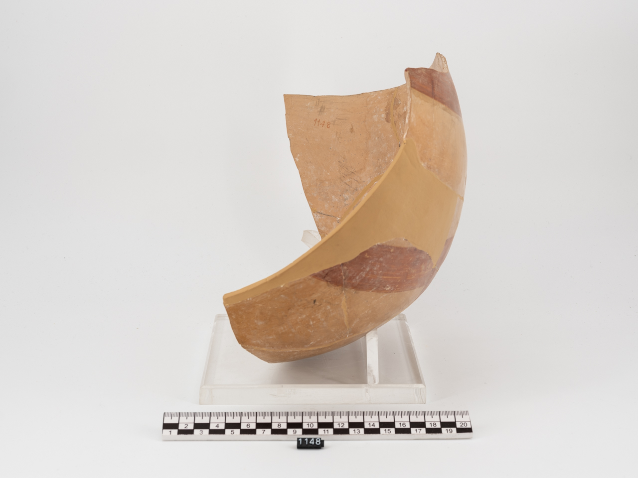 Frammento di grande vaso in ceramica figulina ben levigata, di colore camoscio, con bocca leggermente ristretta, corpo sferoidale e fondo convesso. Coppia di fori per riparazione