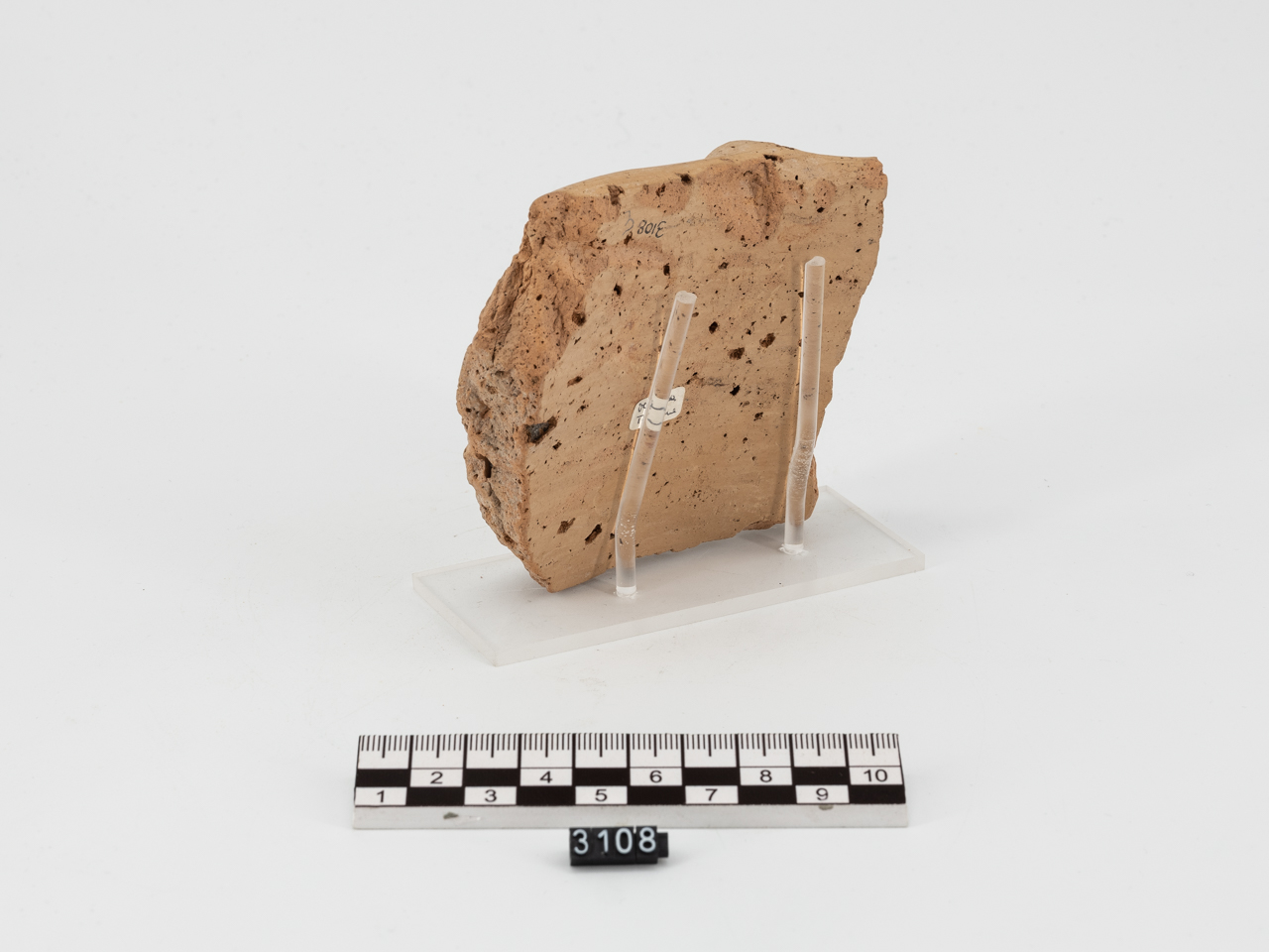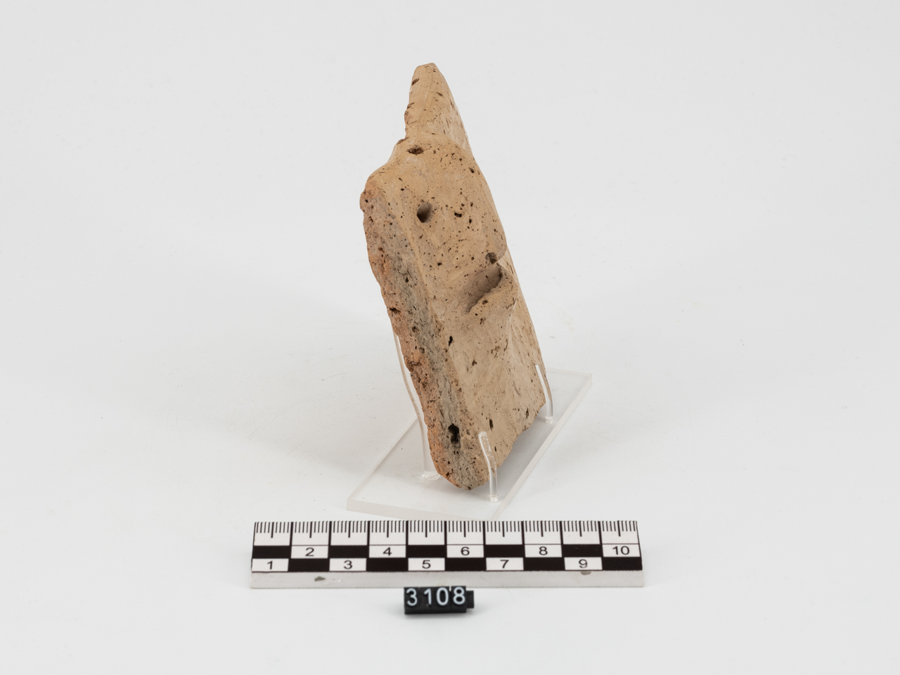 Frammento di orlo di vaso, ad impasto poco depurato e superficie giallina levigata, con una grande protome antropomorfa "a naso" con occhi indicati da due forellini non passanti, e bocca indicata da un largo solco orizzontale (35x7 mm)