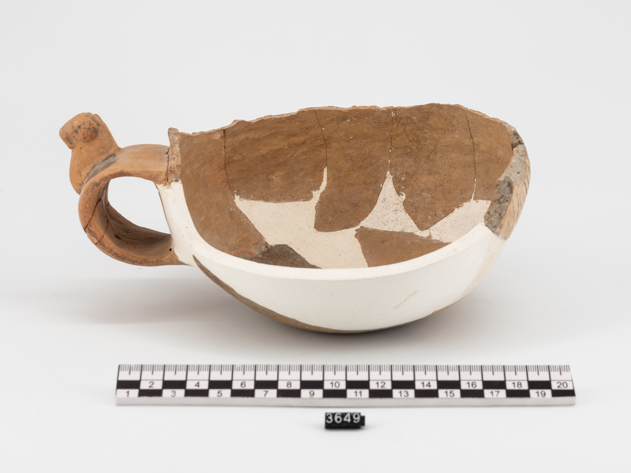 Grande tazza in argilla figulina, lucida, di color giallo-rosato, con largo e alto collo, corpo globulare, ansa a nastro sormontata da una protome animale stilizzata