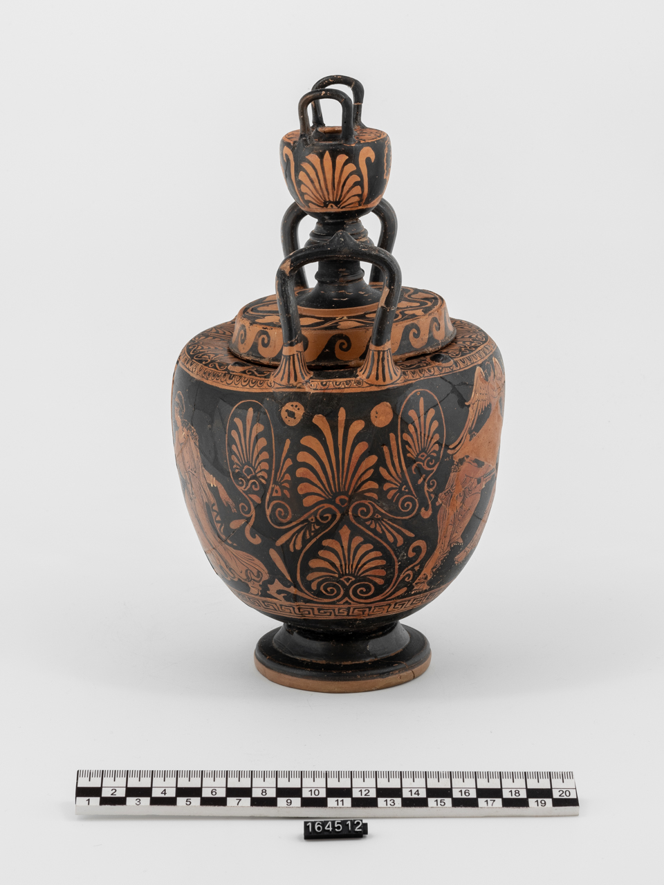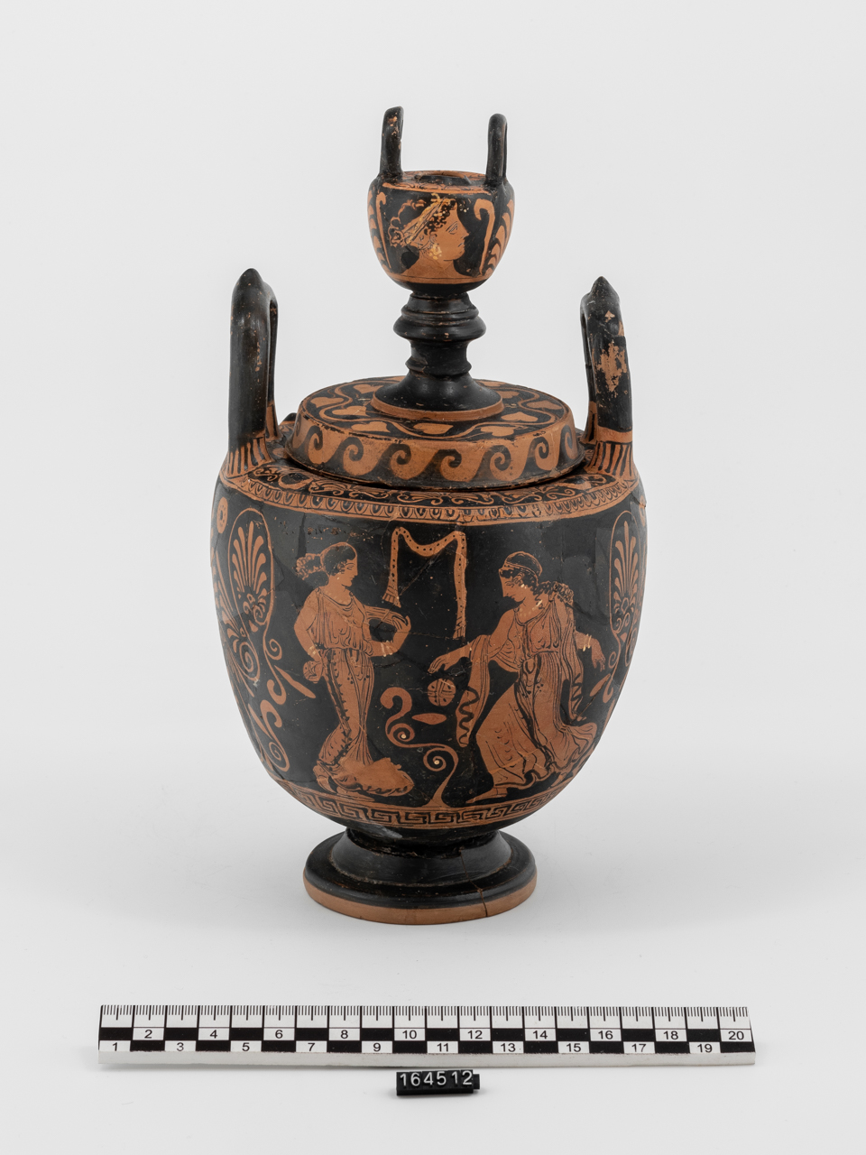 piede campanulato modanato, corpo ovoidale, spalla orizzontale, orlo scanalato per l'alloggio del coperchio, anse verticali a bastoncello; coperchio ad orlo verticale, tesa orizzontale con pomello configurato a lebes miniaturistico su fusto modanato