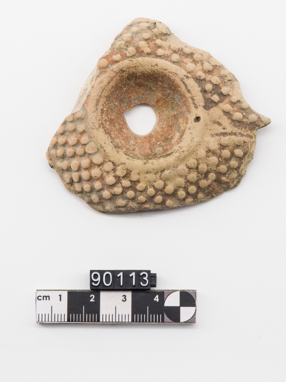 Parte del disco, della spalla con decorazione a perline e attacco del becco con foro di areazione. Il disco ribassato e concavo presenta il foro di areazione delimitato da un cerchio concentrico. Resti di vernice rossa