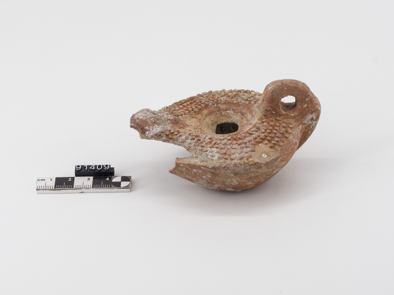 Disco circolare con decorazione a perline, becco a volute, ansa verticale ad anello con una solcatura centrale e tre sull'attacco. Il disco ribassato e concavo presenta il foro di areazione delimitato da due cerchi concentrici. Il fondo circolare piatto è delimitato da due solcature concentriche. Resti di vernice rossa