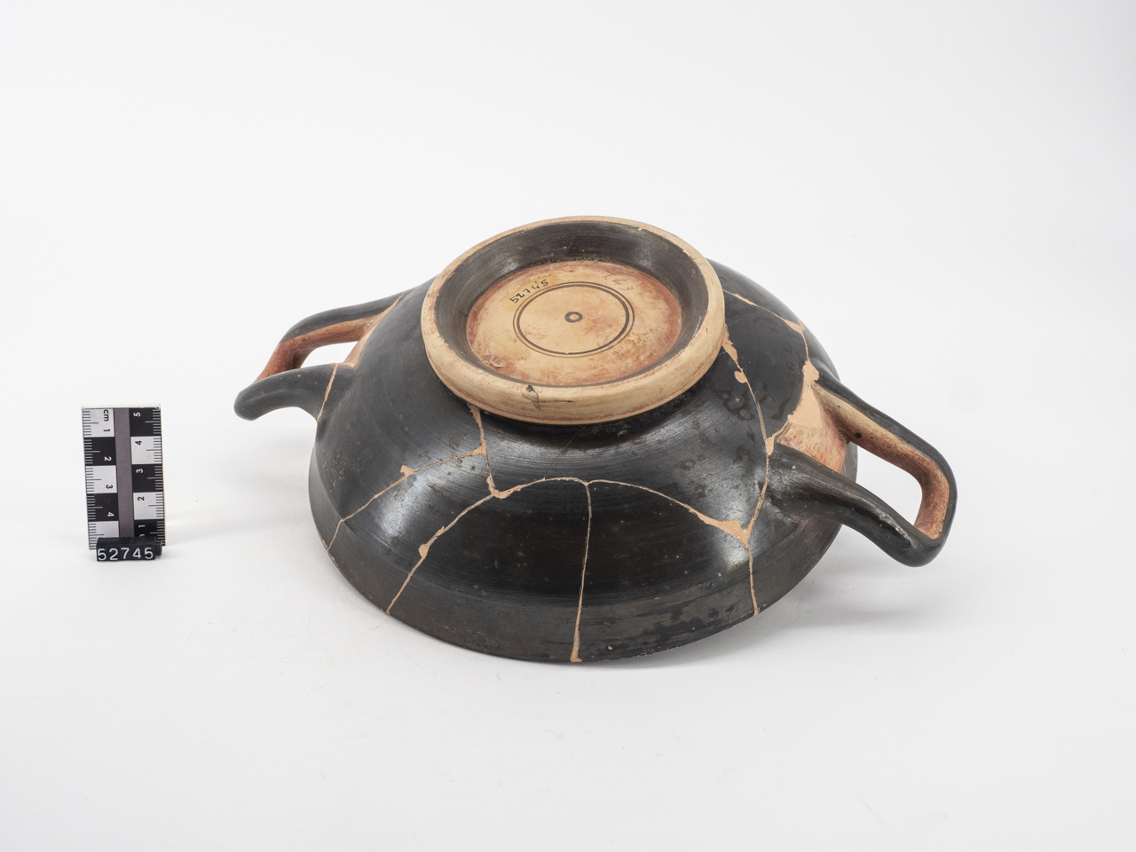 Kylix a vernice nera su basso piede ad anello. Orlo distinto dal bacino mediante carenatura. La vernice lustra ha iridescenze metalliche