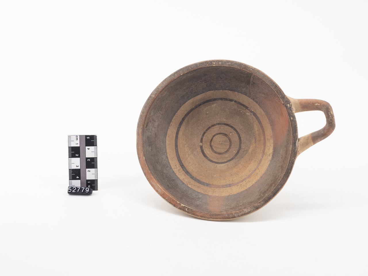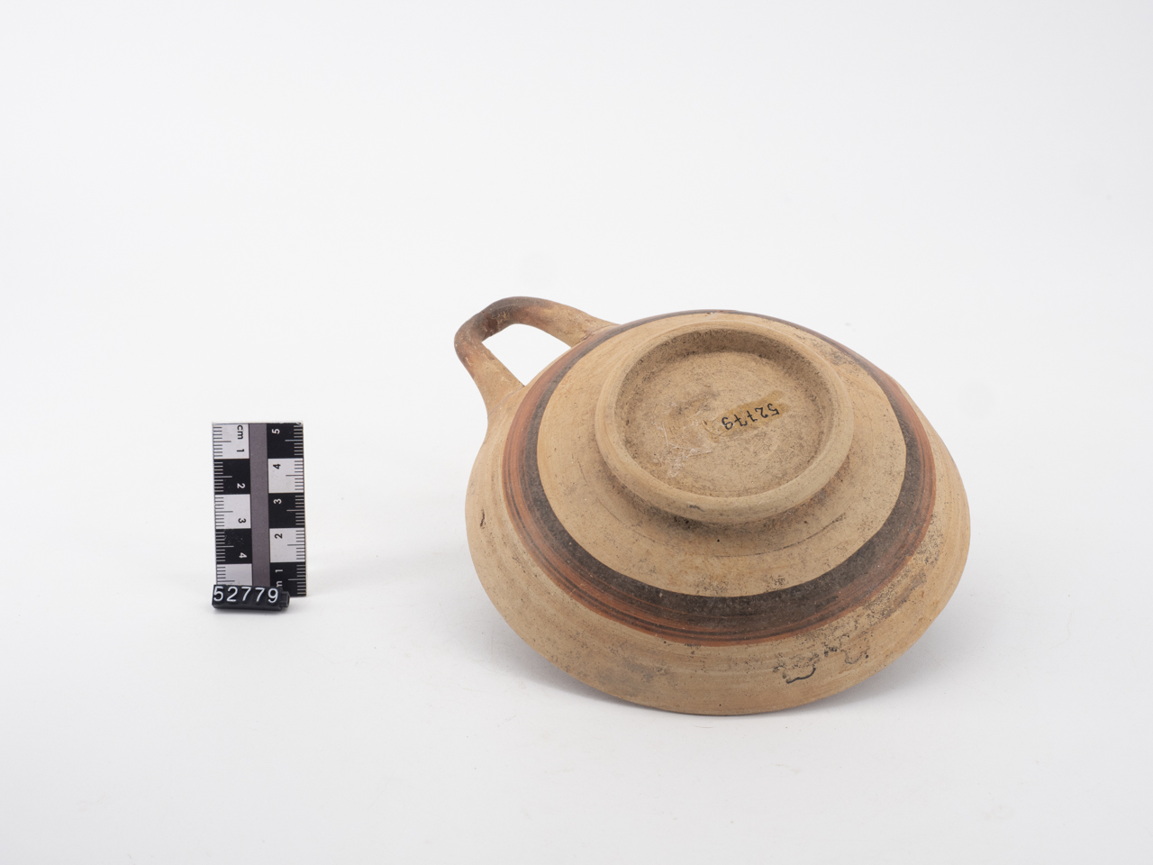Coppetta monoansata di argilla nocciola con decorazione a fasce di vernice rossastra. Piede ad anello, bacino a profilo convesso, ansa orizzontale impostata sull'orlo