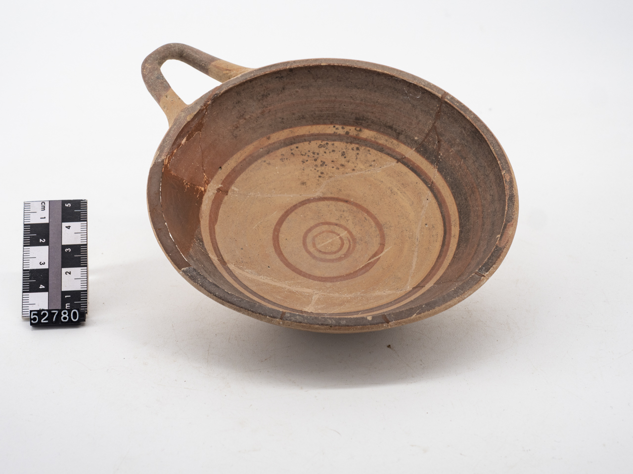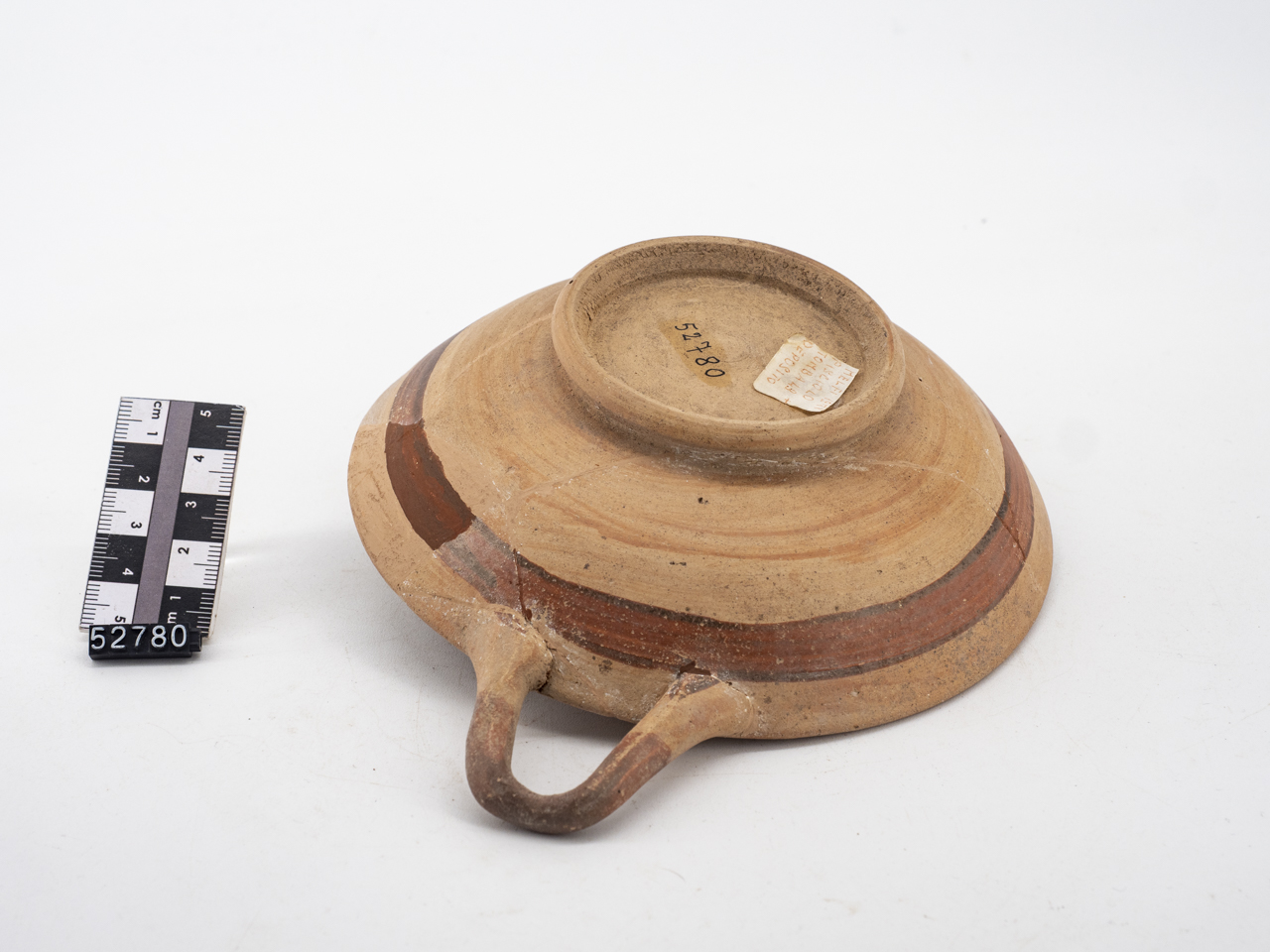 Coppetta monoansata di argilla nocciola con decorazione a fasce di vernice rossastra. Piede ad anello, bacino a profilo convesso, ansa orizzontale impostata sull'orlo
