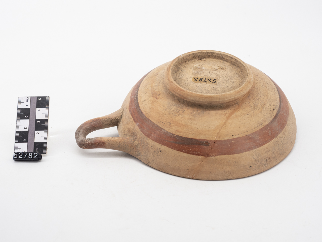 Coppetta monoansata di argilla nocciola con decorazione a fasce di vernice rossastra. Piede ad anello, bacino a profilo convesso, ansa orizzontale impostata sull'orlo