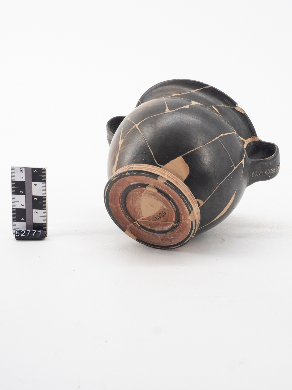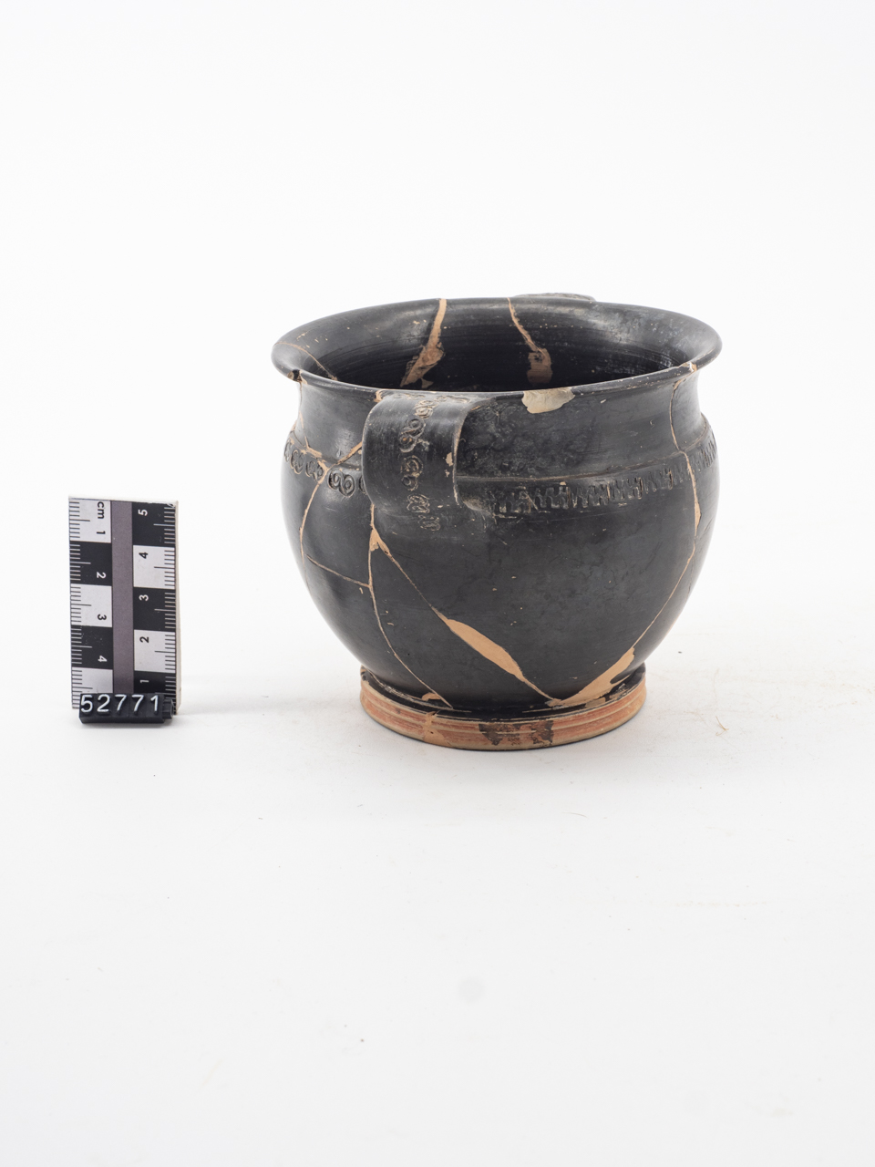 Skyphos a vernice nera con decorazione impressa. Il corpo ovoidale è distinto dall'orlo mediante una risega. Al di sotto di questa corre da un lato, una serie di elementi rettangolari a doppia dentellatura e dall'altro una fila di doppie volute contrapposte. Questo secondo motivo ritorna sulle due anse verticali a nastro. Sul fondo, risparmiato una costolatura circolare verniciata delimita una fascia impressa a rotelle