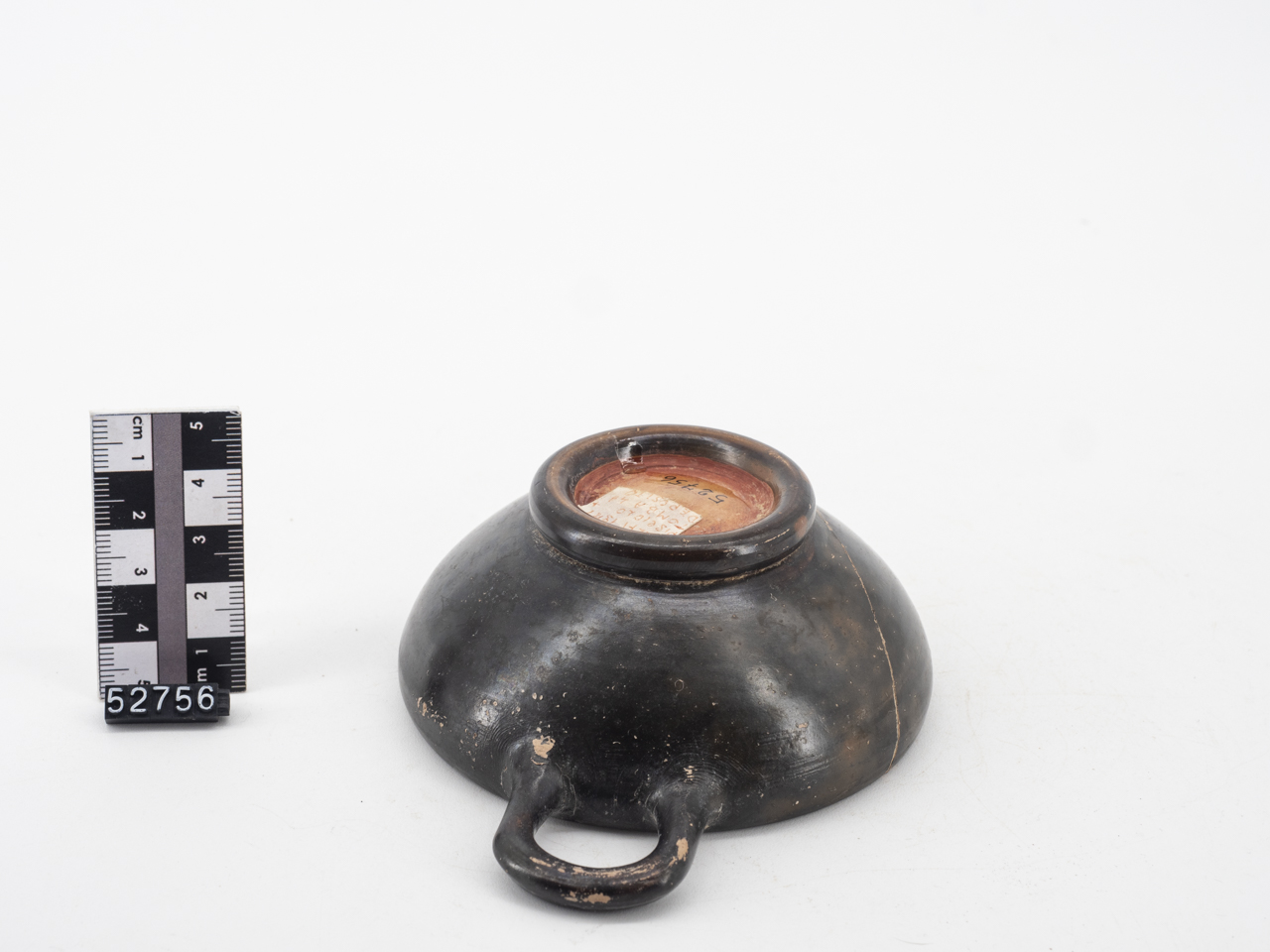 Coppetta monoansata a vernice nera, presenta vasca a calotta e fondo ad anello, risparmiato