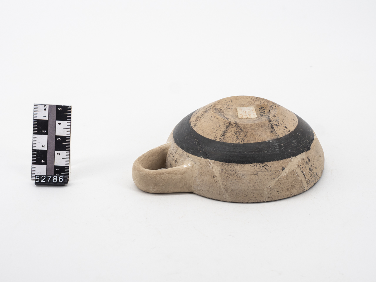 Ciotola monoansata di argilla chiara a vernice nera. Bacino a profilo convesso con base piana, ansa orizzontale a nastro. La parete esterna del bacino è verniciata solo in una fascia mediana