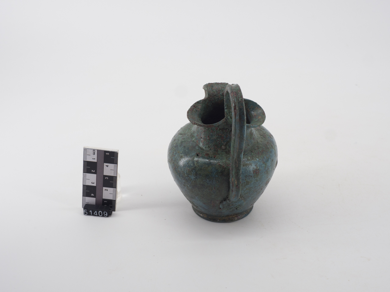 Oinochoe di bronzo con orlo trilobato e collo troncoconico; presenta breve spalla ribassata orizzontale. L'ansa sormontante verticale scanalata termina all'attacco inferiore con una protome leonina