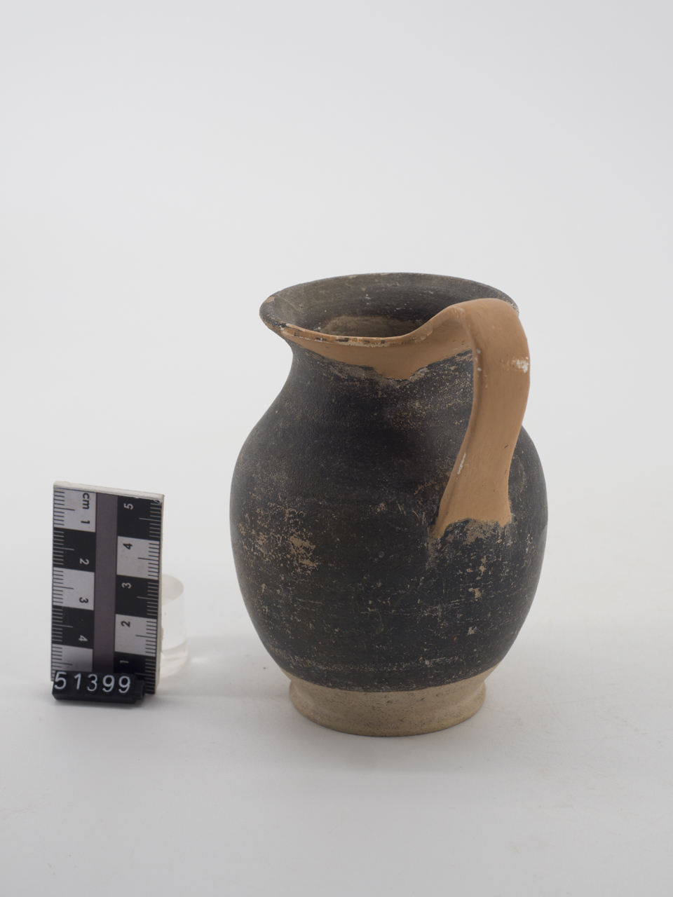 Brocchetta a vernice bruna con corpo allungato espanso all'orlo ad ansa sormontante a nastro