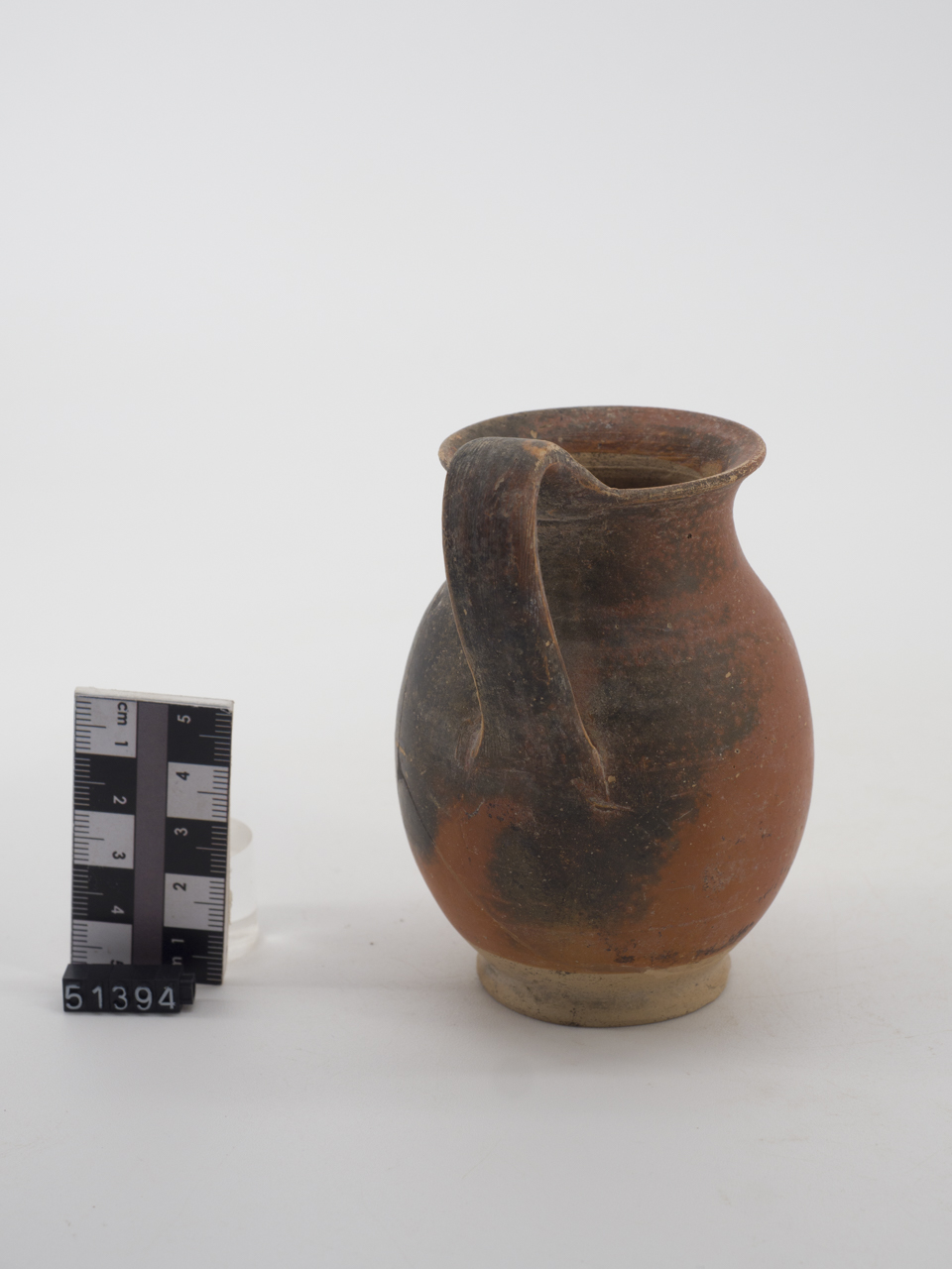 Brocchetta a vernice rossastra con corpo allungato espanso all'orlo ed ansa sormontante a nastro