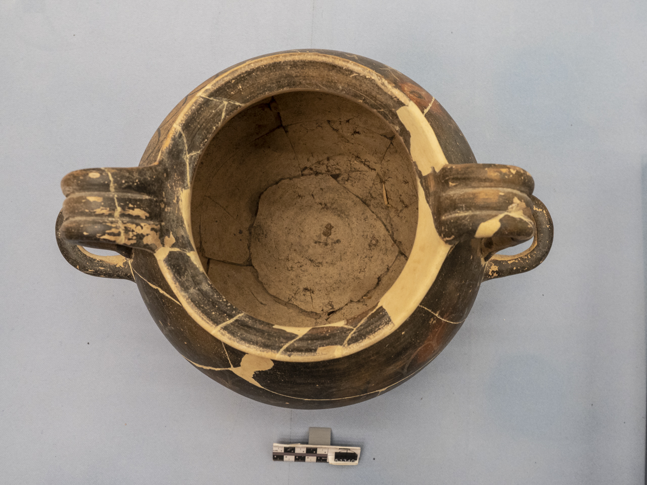 Cratere a quattro anse a vernice bruna. Corpo biconico con piede ad echino capovolto; orlo espanso. Due anse orizzontali a bastoncello sormontate da due anse verticali a nastro tricostolato. Nella metà superiore serie di foglie cuoriformi unite da archetti in bianco sovrappinto. In corrispondenza delle anse orizzontali fascia risparmiata e riempita a reticolo punteggiato all'interno di ogni maglia