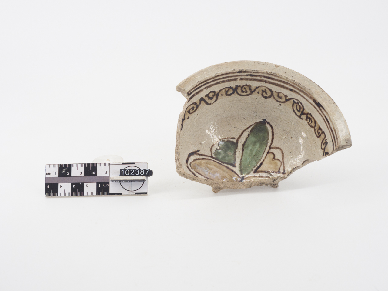 Ciotola con bassa carena, orlo leggermente estroflesso, piede ad anello. Rivestimento vetroso sulla superficie interna del corpo ceramico e, all'esterno, fino a comprendere l'orlo, tipo protomaiolica