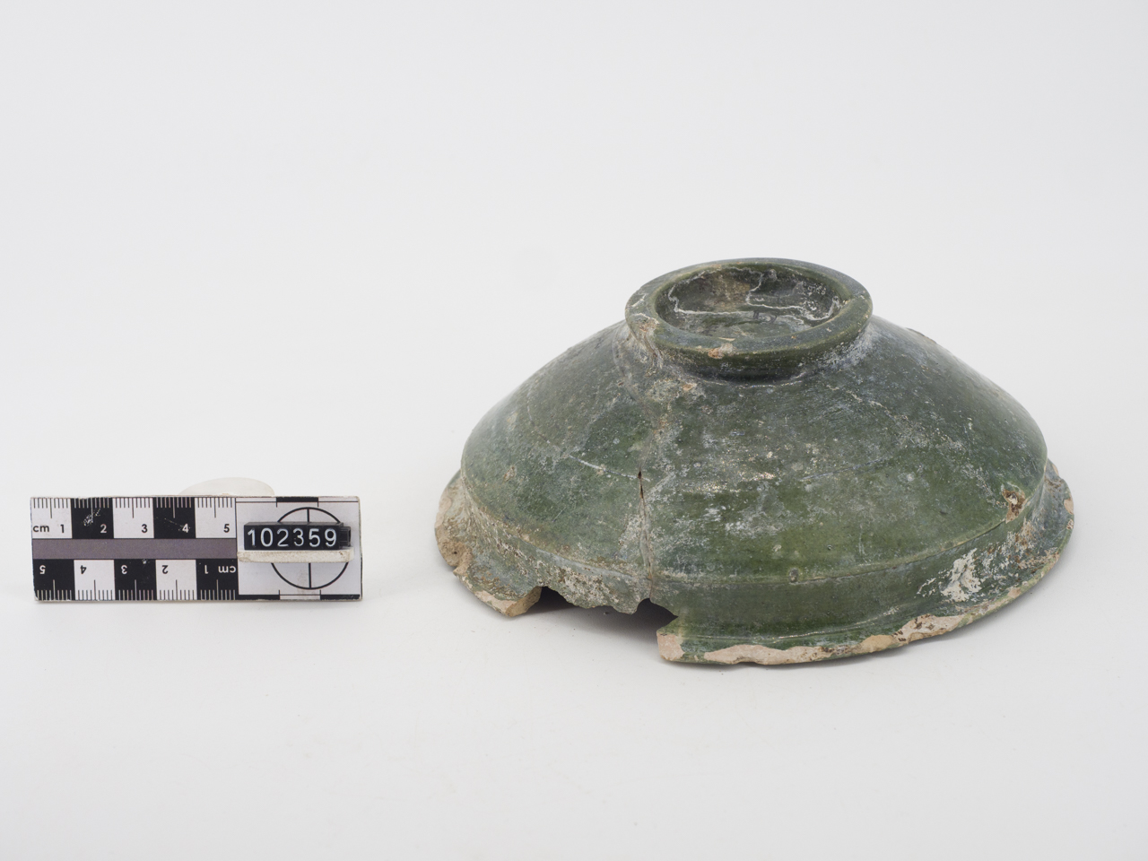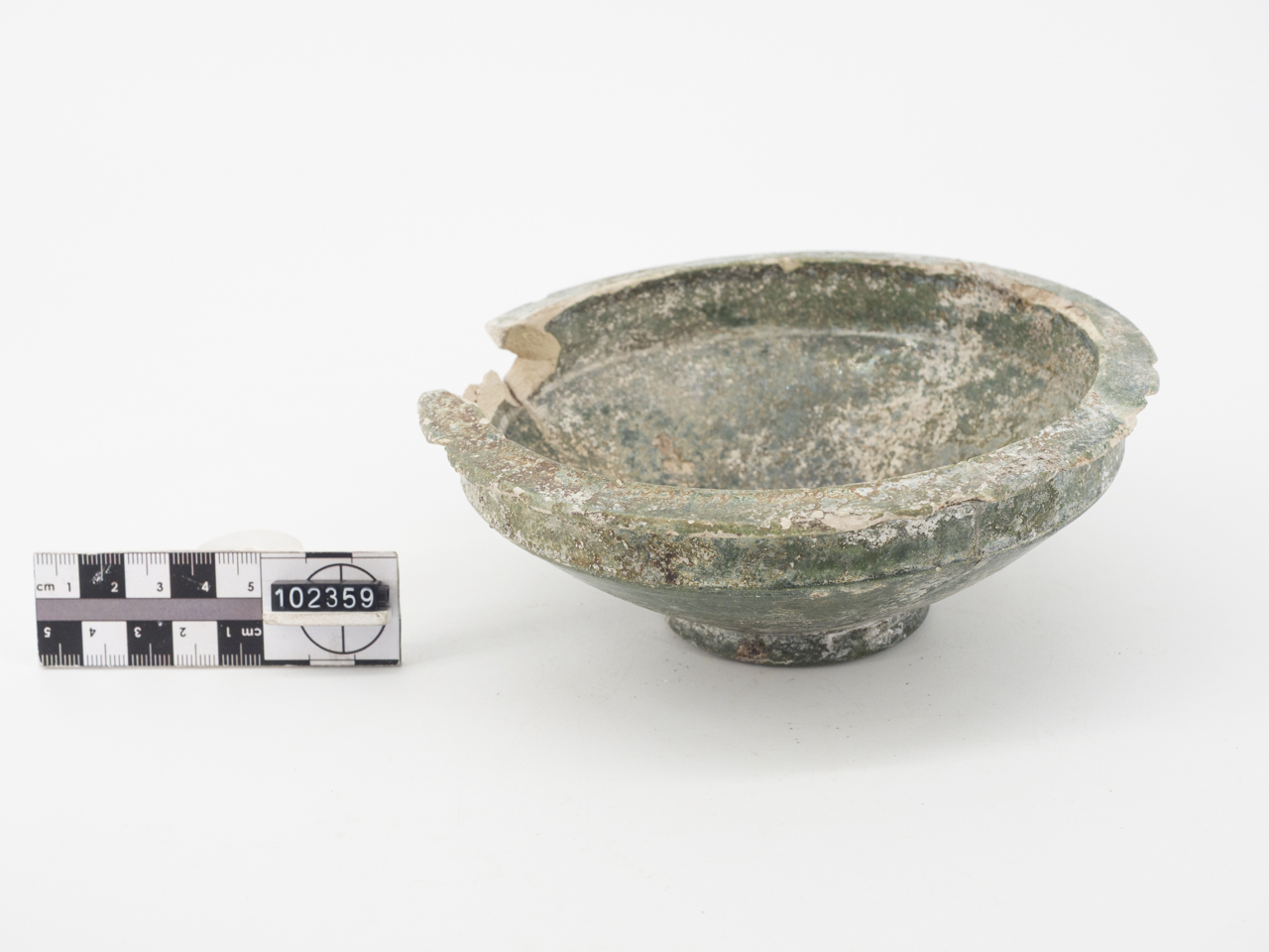 Ciotola dal corpo con alta carena pronunciata, orlo appiattito, estroflesso, obliquo verso l'esterno, piede ad anello. Rivestimento vetroso monocromo verde steso su tutta la superficie del corpo ceramico. Impasto beige-rosa