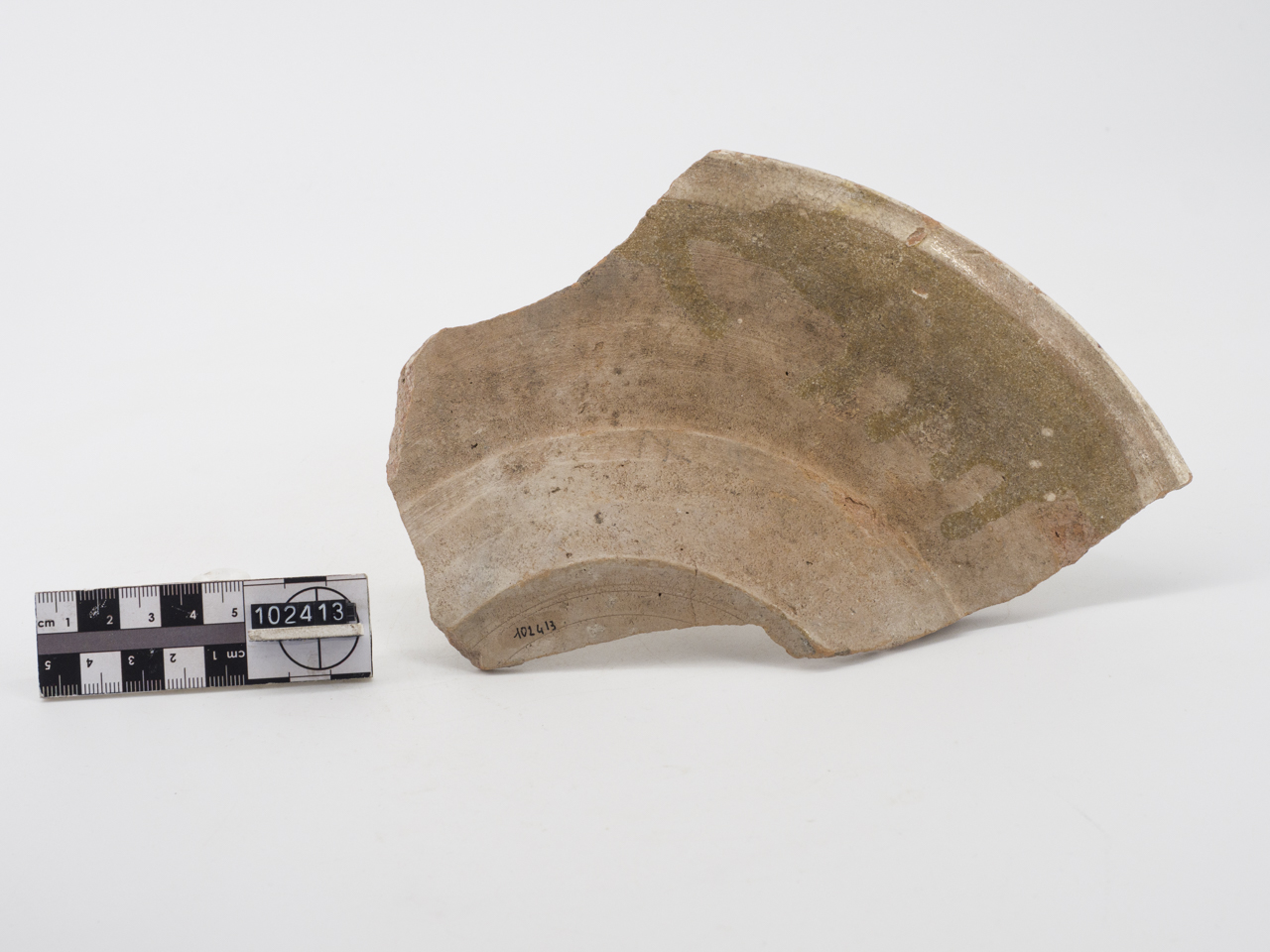 Bacino con corpo tronco conico, ampia tesa aggettante, fondo apodo, leggermente concavo. Ingobbio applicato sulla superficie interna del corpo ceramico e all'esterno poco sotto l'orlo. Rivestimento vetroso trasparente all'interno, con ampie sgocciolature all'esterno