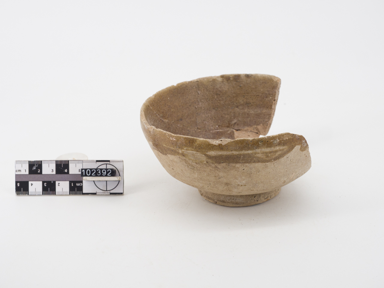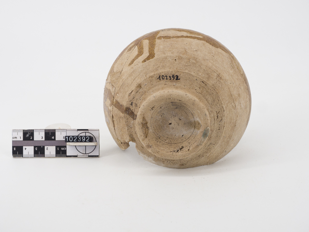 Ciotola con bassa carena, orlo indistinto, leggermente assottigliato, piede ad anello. Rivestimento vetroso giallo scuro sulla superficie interna del corpo ceramico, con sgocciolature all'esterno. Leggero schiarimento superficiale o ingobbio. Argilla beige-rosa