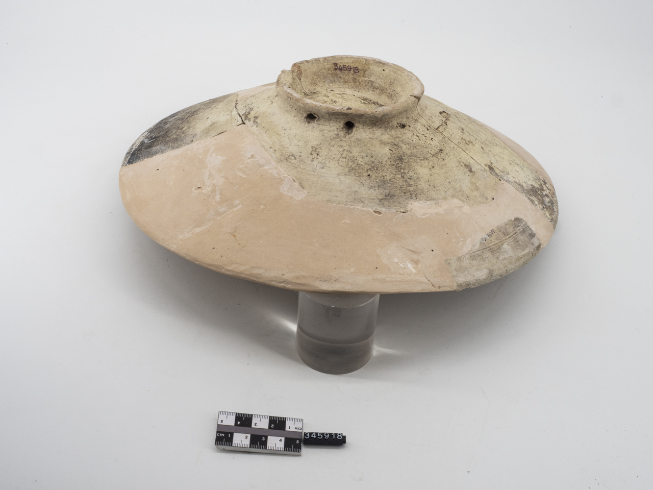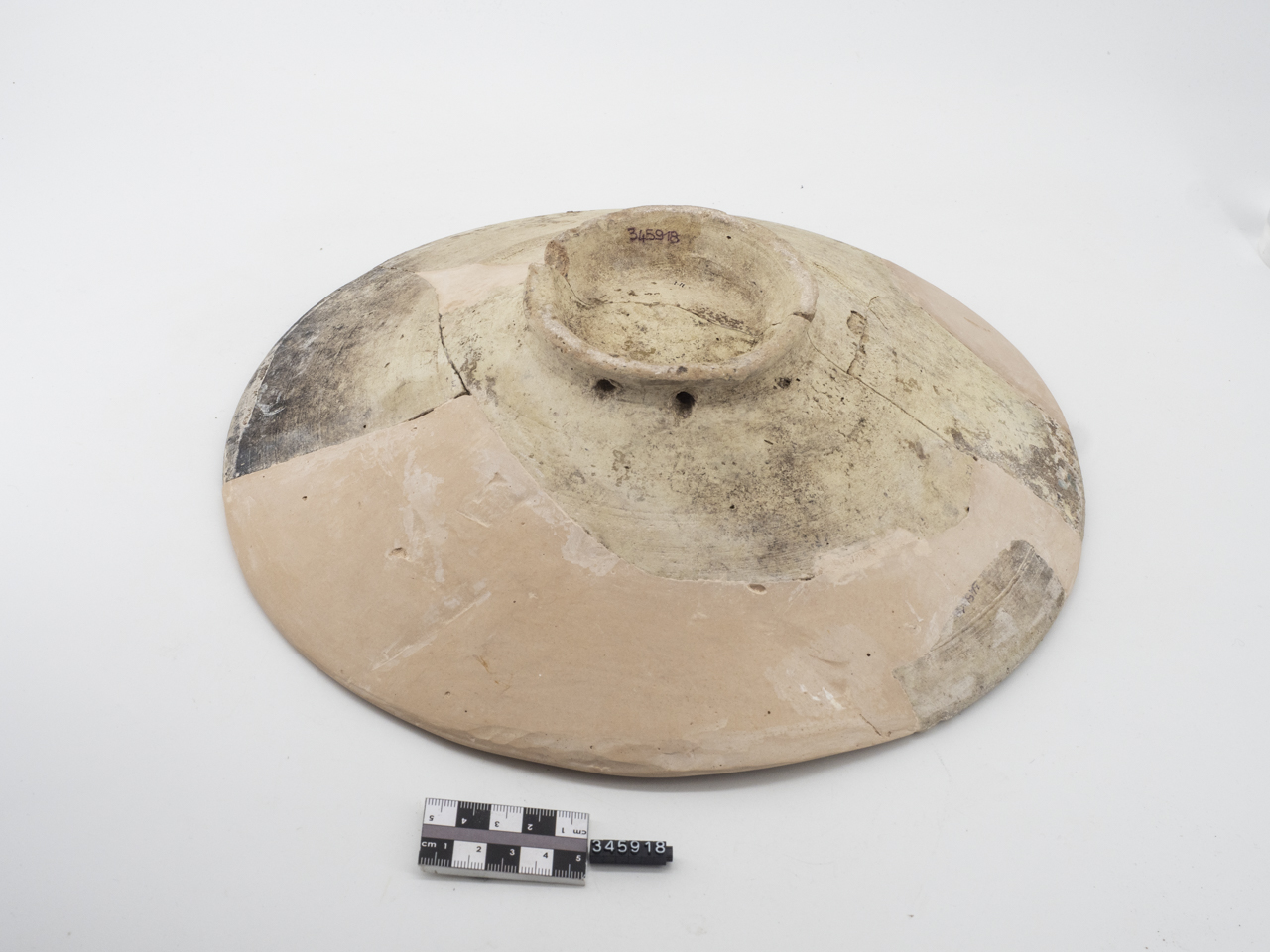 Bacino con corpo tronco conico, orlo a breve tesa aggettante, leggermente obliqua verso l'interno, piede ad anello, umbonato. Sul piede, due piccoli fori passanti per sospensione, praticati "a crudo". Argilla beige-rosa con schiarimento superficiale. Rivestimento vetroso semi coprente, steso sulla superficie interna del corpo ceramico con parziali sgocciolature all'esterno