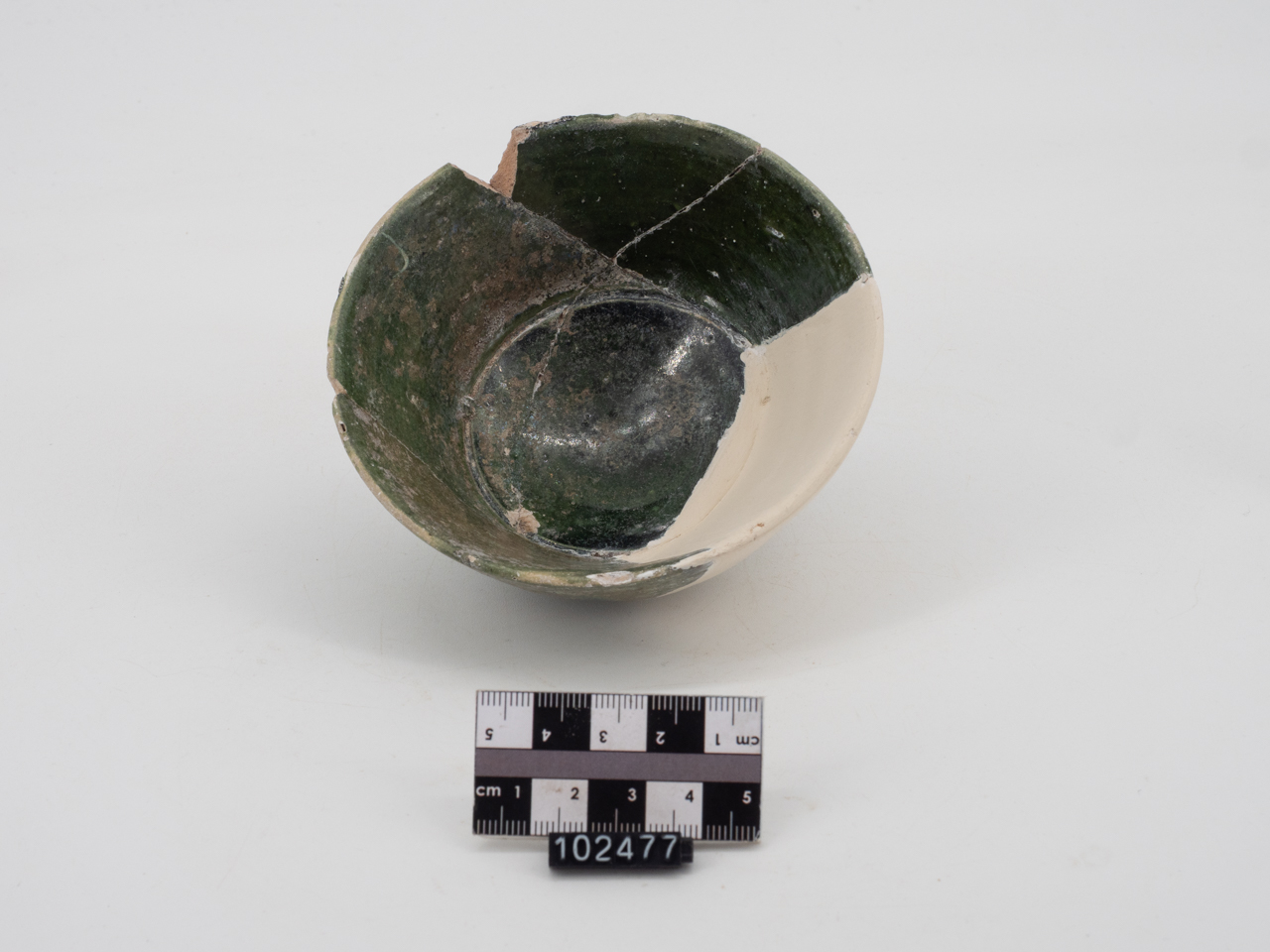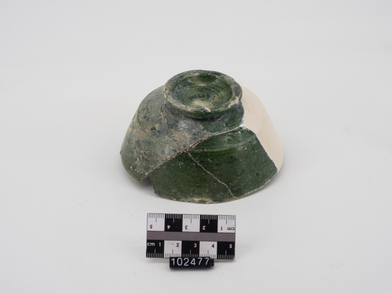 Ciotola con bassa carena, corpo tronco conico, orlo indistinto, piede ad anello. Rivestimento vetroso verde steso su tutta la superficie del corpo ceramico. Argilla rossastra