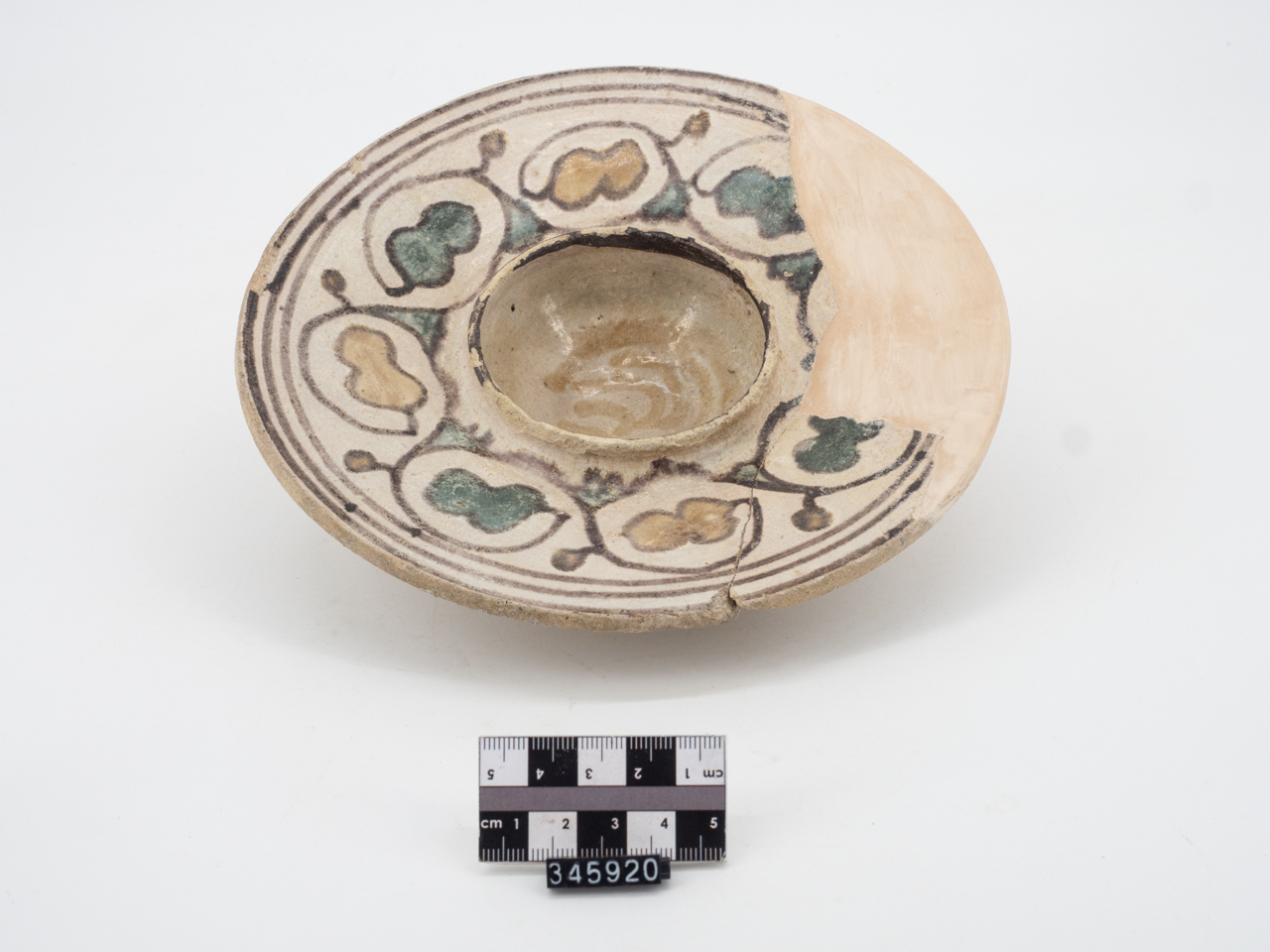 Salsiera con vasca emisferica, ampia tesa, leggermente obliqua verso l'interno, piede ad anello dal profilo tronco conico. Rivestimento vetroso semi coprente steso sulla superficie interna del corpo ceramico