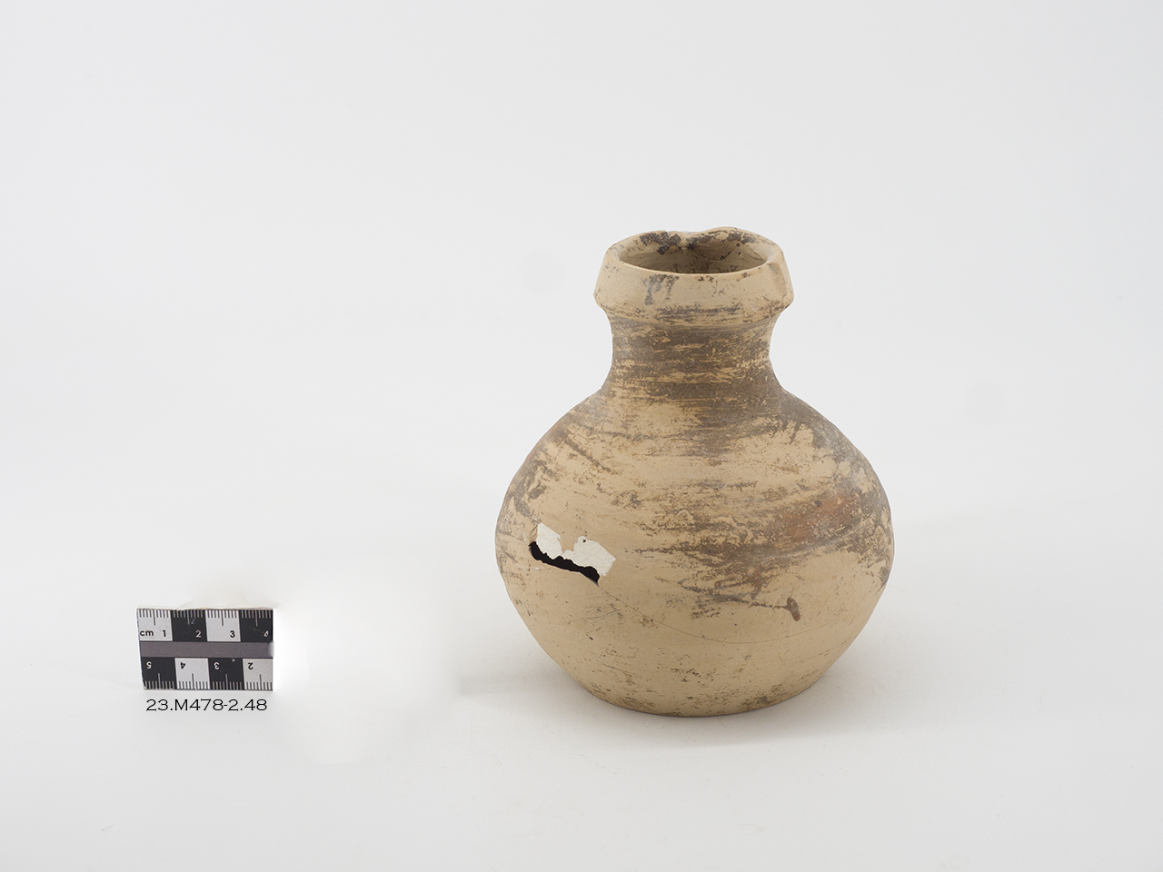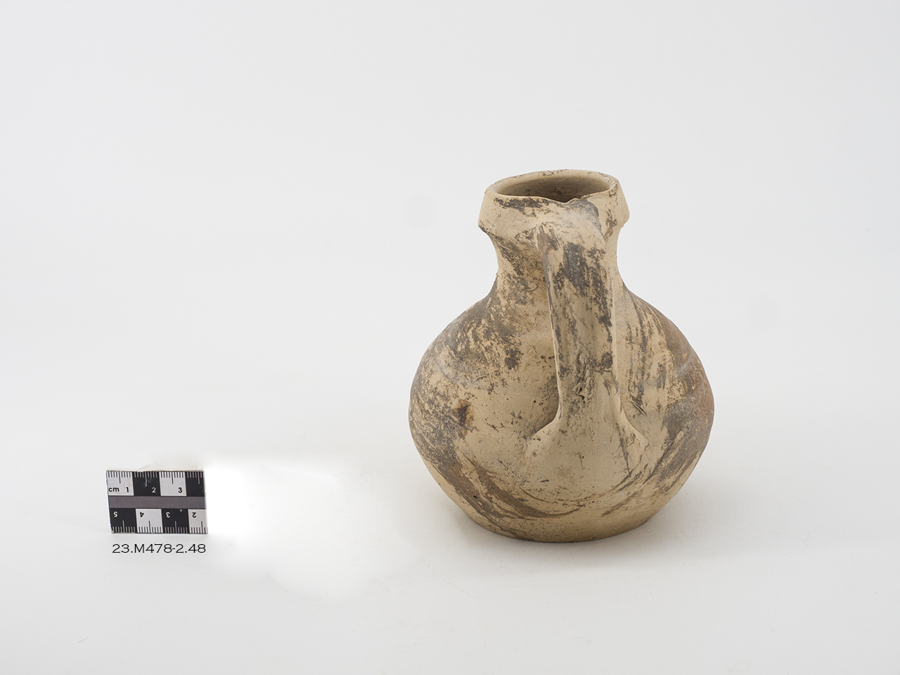 Brocca con corpo globulare, breve collo terminante con orlo triangolare, base piana. Ansa a nastro verticale applicata sul punto di massima espansione del corpo e a livello dell'orlo