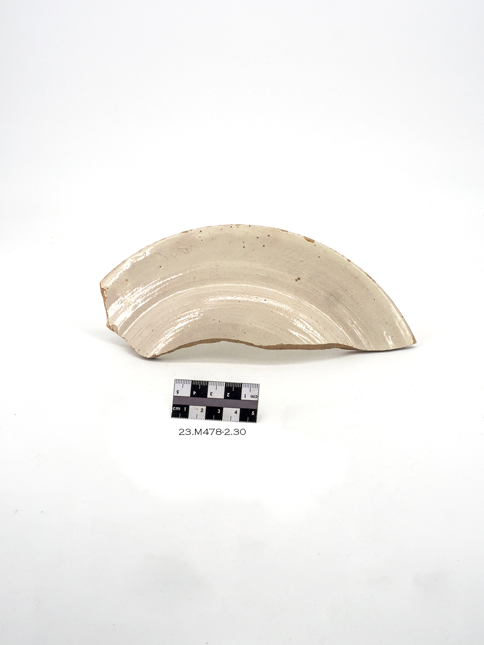 Piatto con bassa vasca, tesa aggettante obliqua, base piana. Rivestimento a smalto biancastro steso su tutta la superficie del corpo ceramico