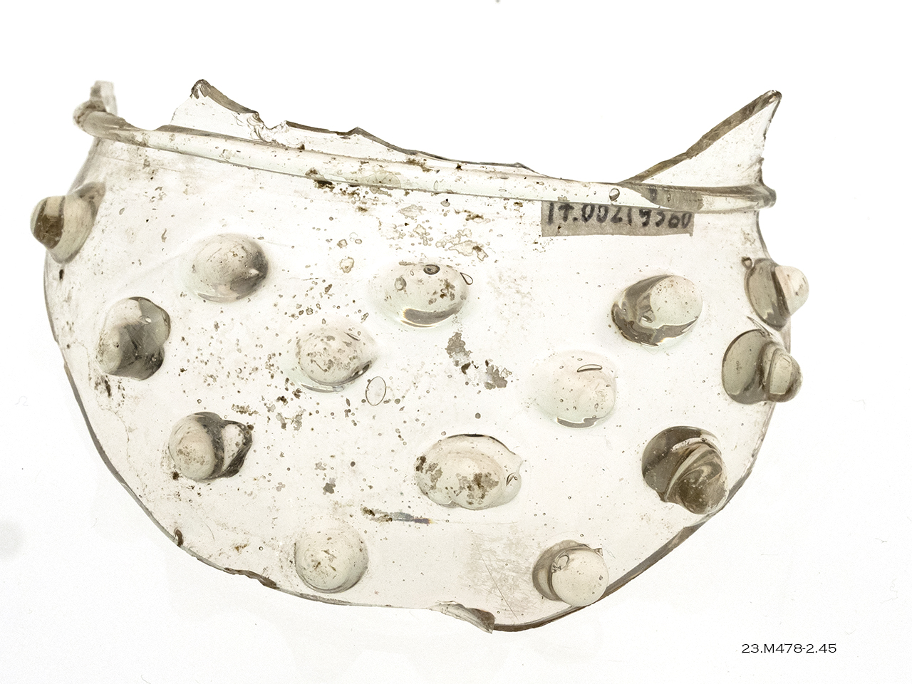 Bicchiere in vetro trasparente tendente al giallo chiarissimo, con corpo dal profilo convesso ed accenno di alto bordo sottolineato da cordolo orizzontale a rilievo