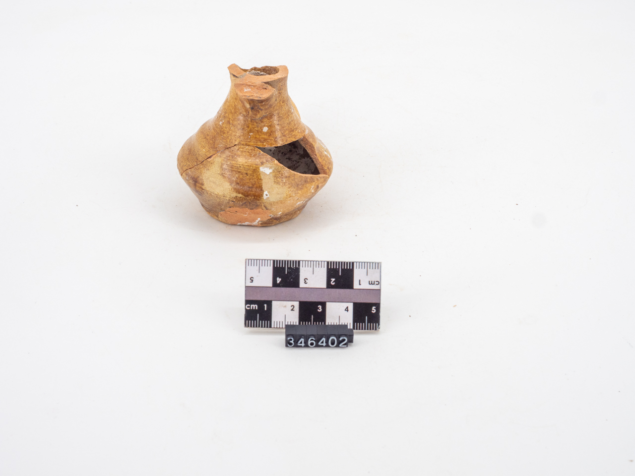 Lucerna a vasca circolare, corpo tronco conico, spalla accentuata con collo pseudo cilindrico, becco ovoidale, base piana. Tracce di attacco di un'ansa a nastro verticale sul collo. Rivestimento vetroso giallino