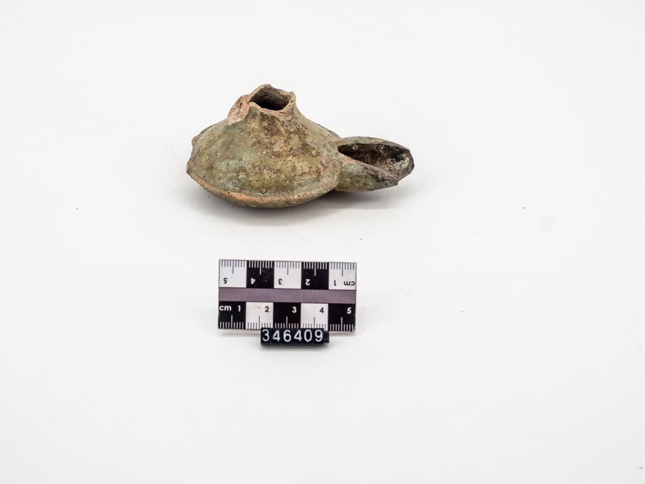 Lucerna a vasca circolare, corpo pseudo biconico con spalla accentuata, accenno di collo, becco ovoidale, base piana. Rivestimento vetroso verde