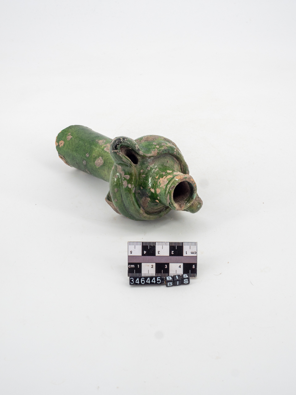 Lampada a stelo cilindrico, terminante con lucerna circolare con spalla pronunciata, alto collo ed orlo arrotondato. Becco ovoidale. Ansa a nastro verticale applicata sul collo e sulla spalla della lucerna. Traccia dell'attacco di un'ansa nella parte superiore dello stelo. Rivestimento vetroso coprente di colore verde scuro
