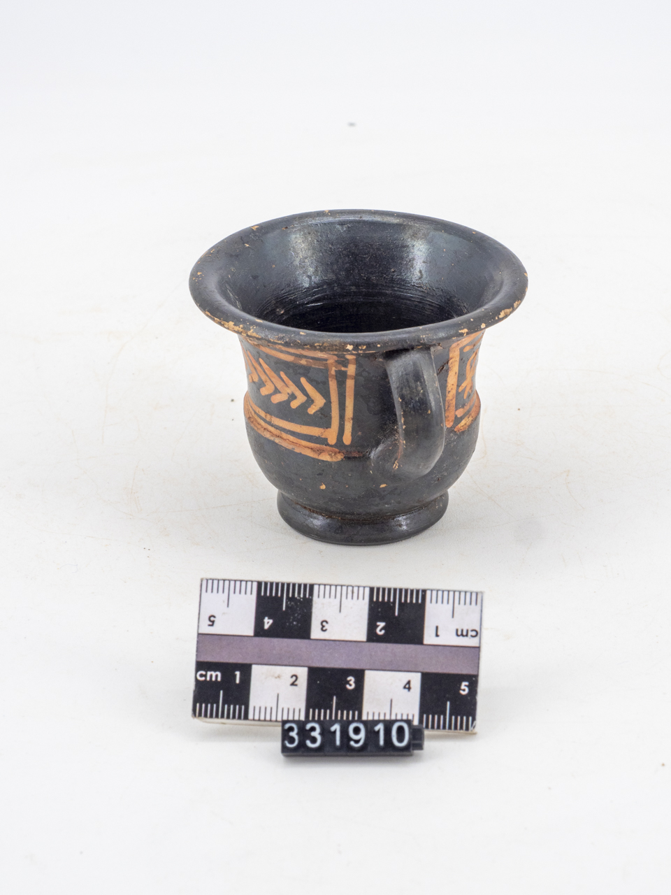 Piccolo skyphos con orlo assottigliato e leggermente estroflesso. Corpo ovoidale e piede a disco. Anse a bastoncello orizzontale